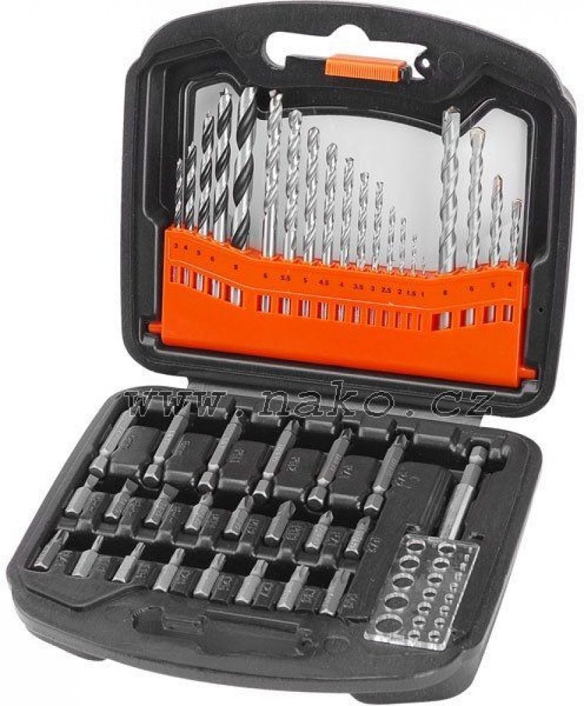 Vrtáky do kovu 1-1,5-2-2,5-3-3,5-4-4,5-5-5,5-6mm Vrtáky do dřeva 3-4-5-6-8mm Vrtáky do zdiva 4-5-6-8mm Hroty 1/4"x25mm (-) 4-5-6mm, PH1-2-3, PZ1-2-3, TORX10-15-20-25-27-30-40 Hroty 1/4"x50mm (-) 4-6mm, PH1-2, PZ1-2 Držák 1/4" hrotů 60mm; šablona na zjišťování průměrů 1-10mm Vrtáky a hroty z kvalitní CrV oceli a rychlořezné HSS ocelirtáky do dřeva 3-4-5-6-8mm Vrtáky do zdiva 4-5-6-8mm Hroty 1/4"x25...