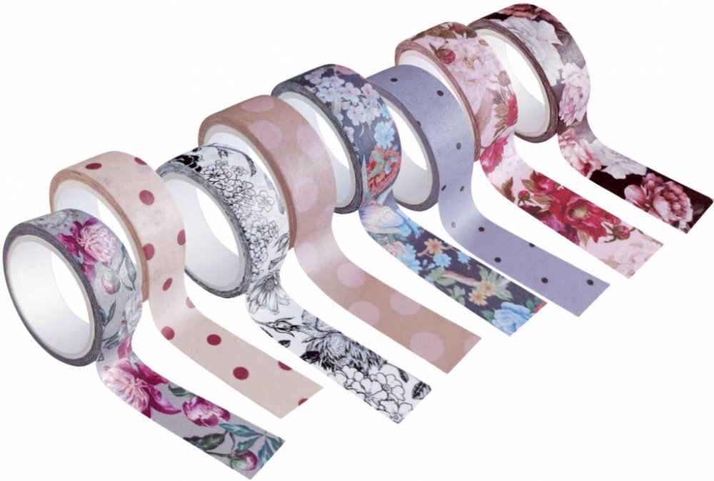 - Sada obsahuje 8 různých motivových pásek: 3x tečky, 5x květiny.