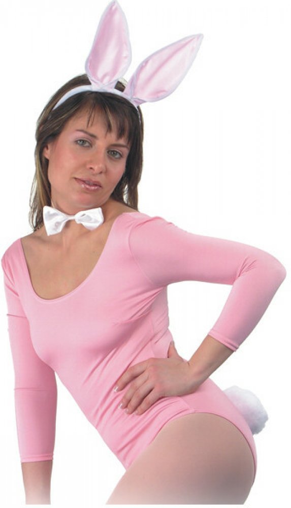 Látkový zajíčkový set s čelenkou s dlouhýma růžovo-bílýma ušima, bílým motýlkem a bílým ocáskem.