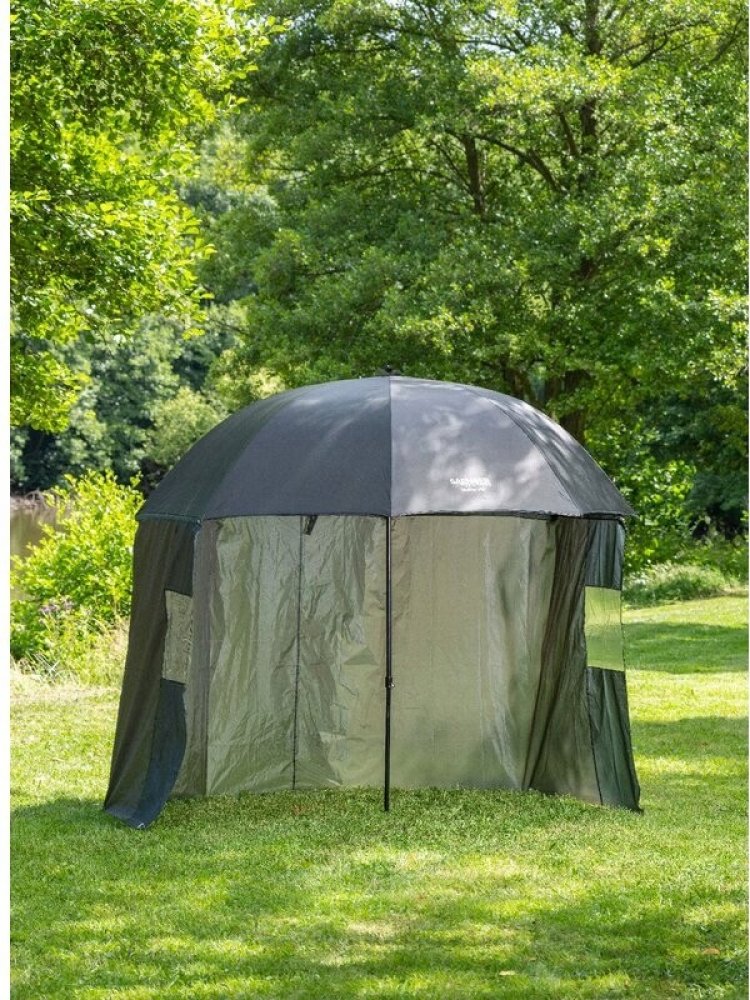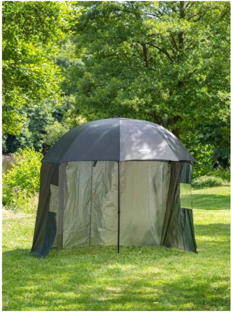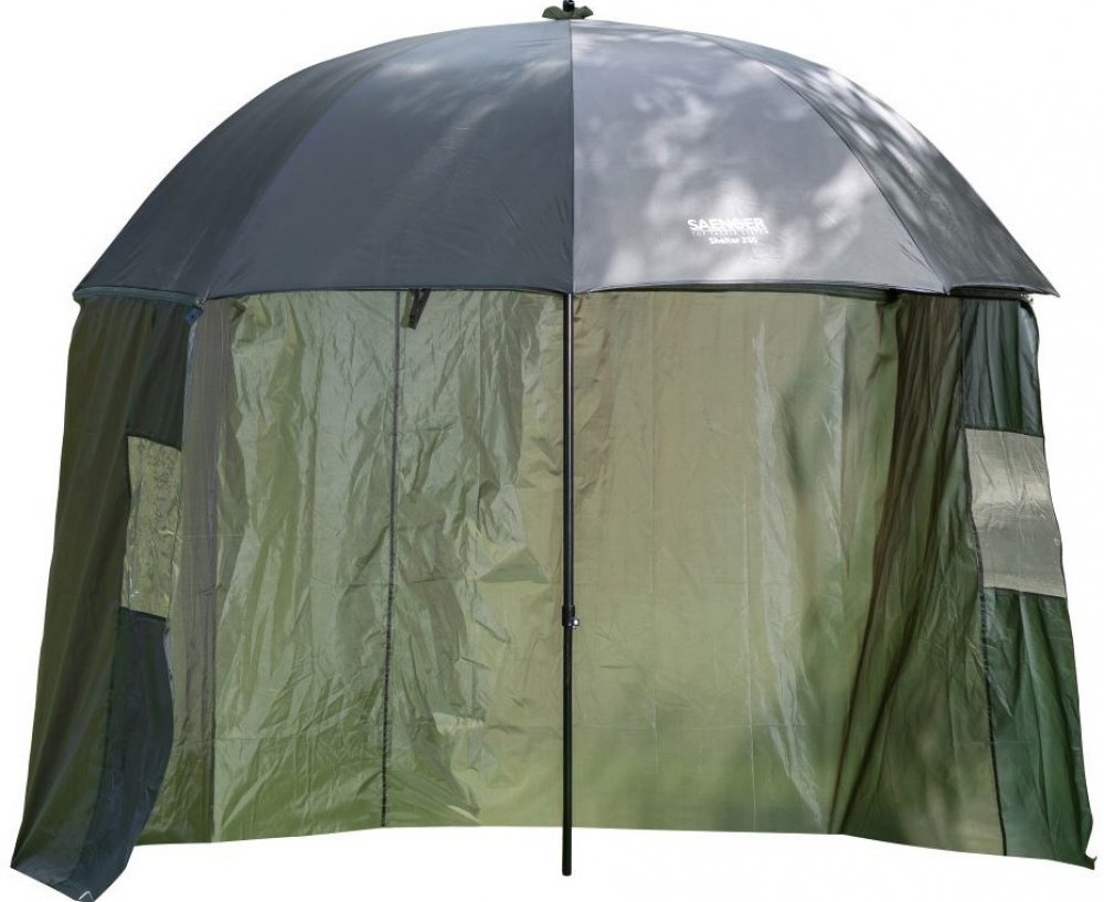 Rybářský deštník s bočnicí z 190T polyesteru. Podlepené švy, teleskopická robustní kovová středová tyč a žebra z ocelových drátů. Deštník lze naklápět. Průměr při rozložení je 190 cm, výška bočnice 130 cm a maximální výška 180 cm. Díky bočnici budete perfektně ochráněni před deštěm a větrem. Pro zvýšení stability lze Shelter 2,50 ukotvit pomocí kolíků. Nízká přepravní váha 2,5 kg. Dodáván v přepra...