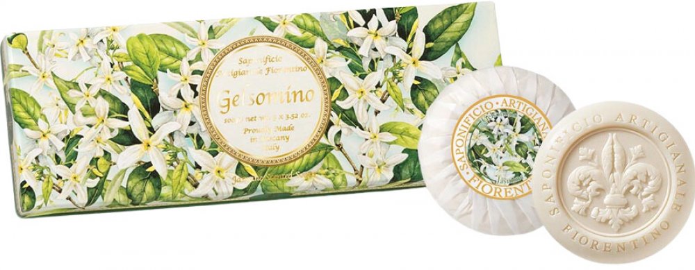 SAF FIORENTINO Mýdla Jasmín 3 x 100 g 100% rostlinné řemeslné jasmínové mýdlo. Rafinovaný a ženský jasmín je květina s jemnou vůní, která evokuje klid. Jemný hydratační účinek těchto mýdel zanechá vaši pokožku hladkou a provoněnou, s pocitem svěžesti po celý den.