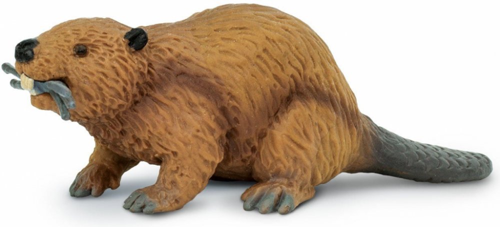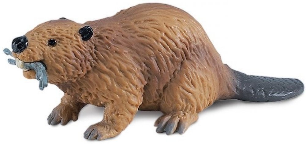 Figurka bobra, vodního hlodavce, který si staví hráze a hrady, ve kterých má své hnízdo. Tato replika bobra si tese větvičku pro záplatování hráze.