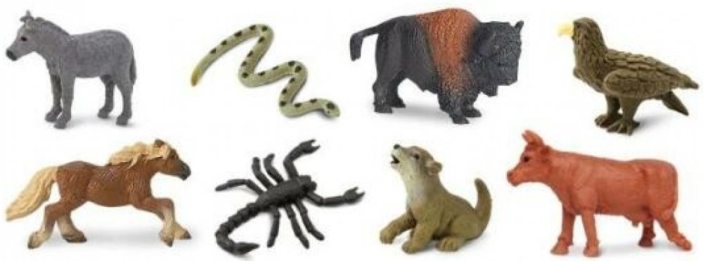 Balení obsahuje: Kravu (cow), Škorpiona (scorpion), Bizona (bison), Osla (donkey), Poníka (pony), Vlka (wolf), Štíra (rattlesnake) a Orla skalního (golden eagle), všechny obyvatele západu USA.
