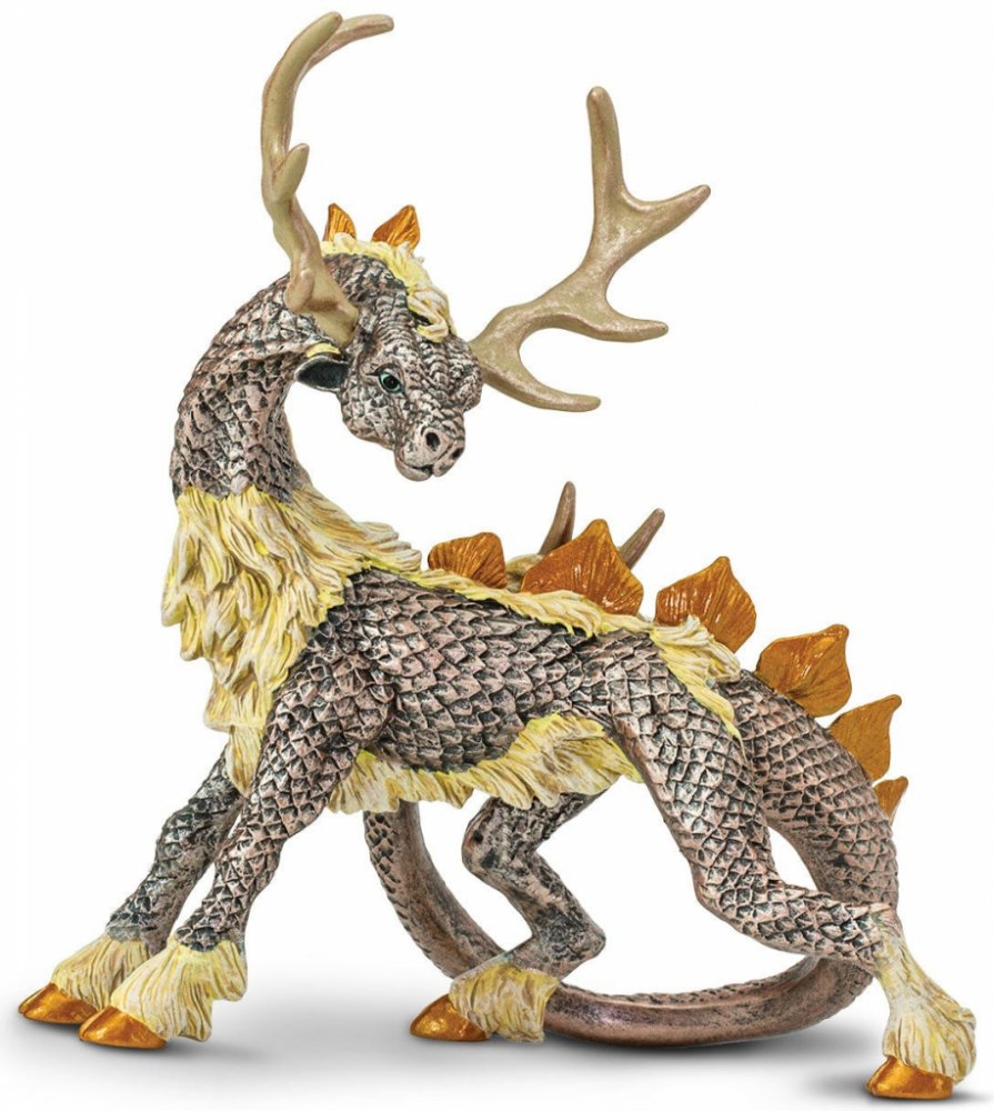 Figurka Jelenovitého draka, extrémně silného, avšak plachého draka, který dává přednost samotě v hlubokých lesích, či divokých oblastech. Díky spojení šupin, ostnů a dlouhého ocasu klasického draka s parohy, kopyty a srstí mocného jelena je tento druh draka skutečnou legendou.