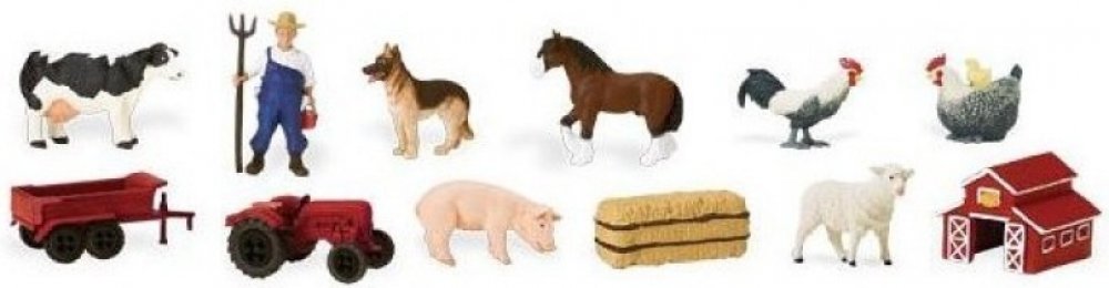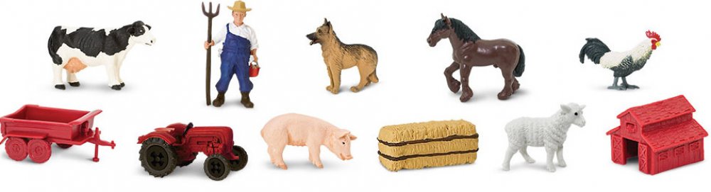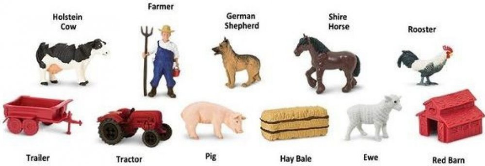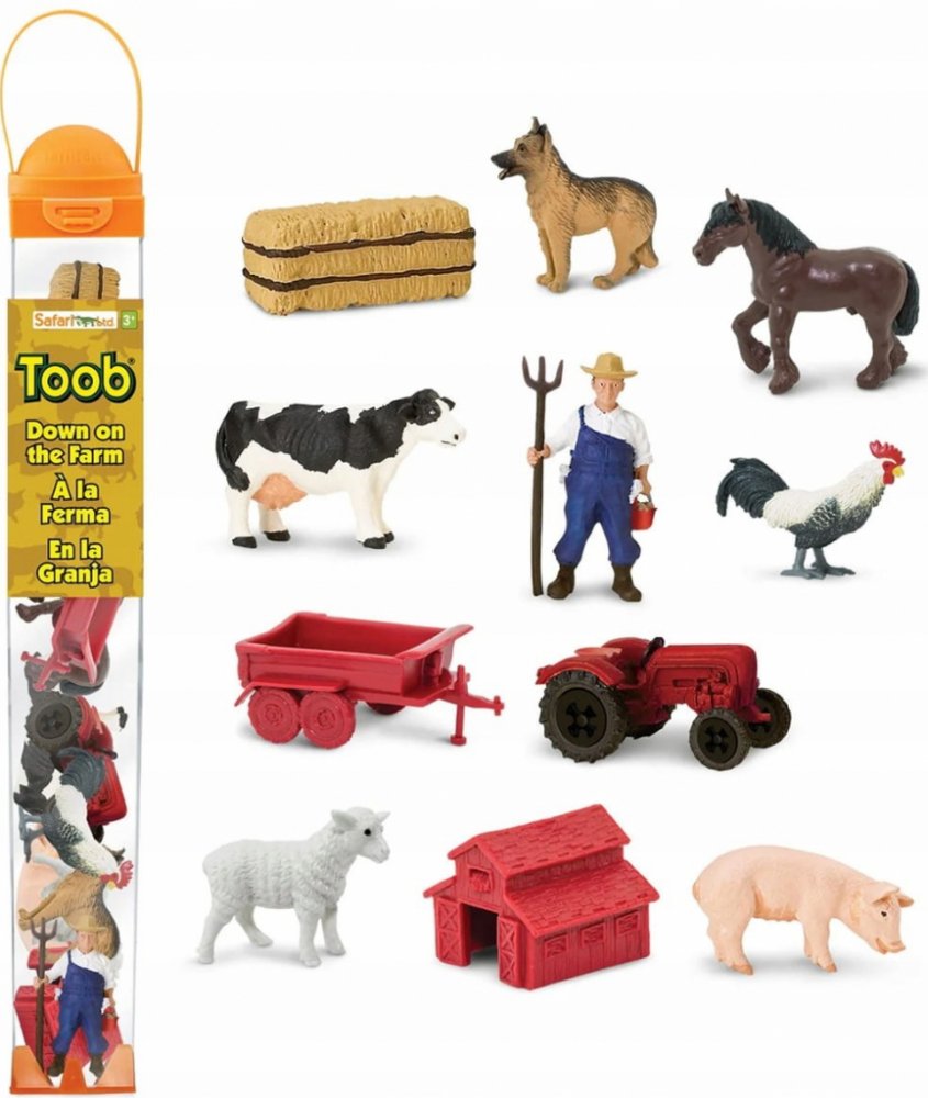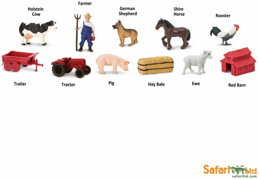 Tuba Na farmě obsahuje 11 figurek o velikosti 4-7,5 cm a zahrnuje následující repliky: kráva, ovčácký pes, kůň, kohout, prase, ovce, farmář, traktor s valníkem, stodola a balík sena.