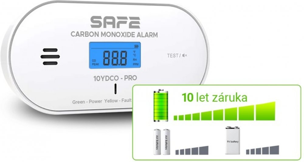 Napájení zajišťuje integrovaná lithiová baterie (zabudovaná, neměnitelná) garantující mimořádně dlouhý provoz zařízení po více než 10 let a prodlouženou 10letou záruku jak na baterii, tak i na samotné zařízení. Hlásič oxidu uhelnatého (CO) SAFE 10YDCO - PRO představuje novou úroveň standardu v oblasti požární bezpečnosti obytných budov.