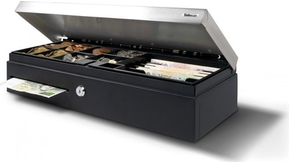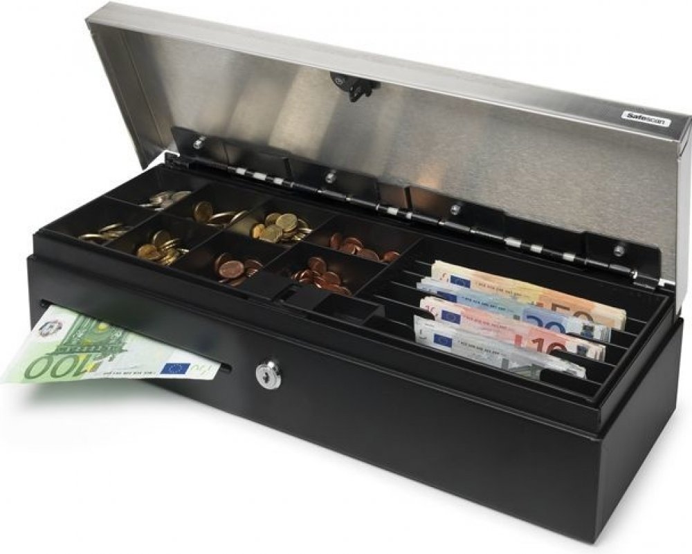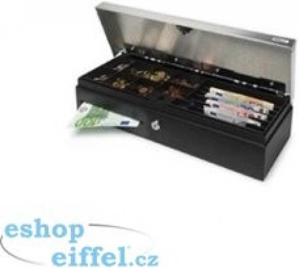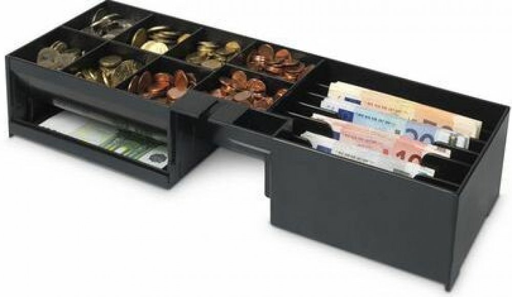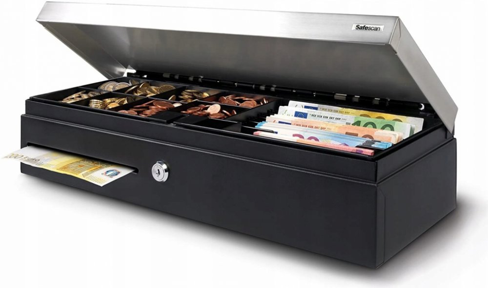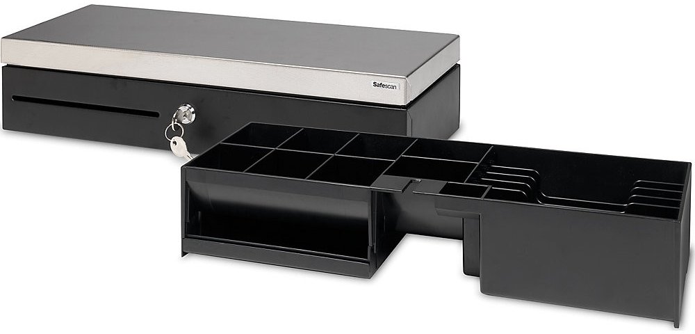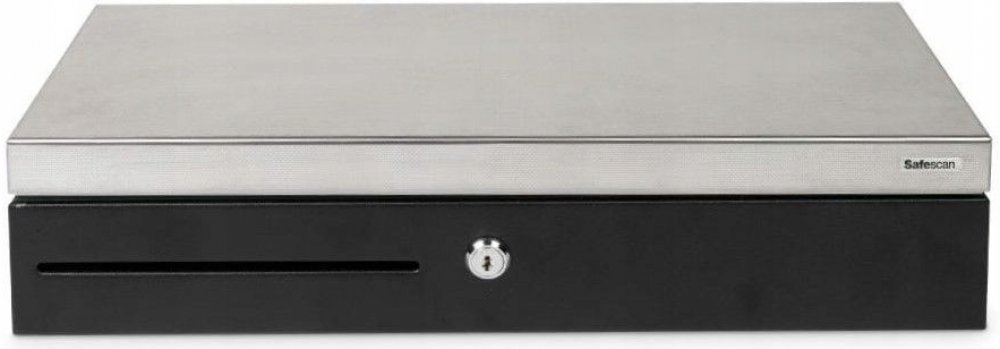 Pokladní zásuvka se sklopným víkem, SAFESCAN SD-4617S, 6 přihrádek na bankovky, 8 pro mince. Dodávka = smontováno. Výška = 100 mm. Šířka = 460 mm. Hloubka = 170 mm. Barva = černá, stříbrná. Materiál = ocel. Robustní design z kovu. Testováno minimálně pro 1 milion otevření. Se 6 přihrádkami na bankovky a 8 pro mince. Kompatibilní s registračními pokladnami RJ12 (12 V / 24 V). Certifikace CE. Díky kompaktnímu designu sklopného víka je tato pokladní zásuvka koncipována speciálně pro menší prodejny. Ražené kovové víko, možnost elektrického otevírání nebo otevírání na klíč. Přestavitelná a vyjímatelná přihrádka. Separační výřez umožňuje skladování velkých bankovek a cenných papírů mimo dohled. Se zajištěním ve dvou polohách (stand-by a otevřeno). Volitelná dodatečná vložka a uzamykatelné víko.