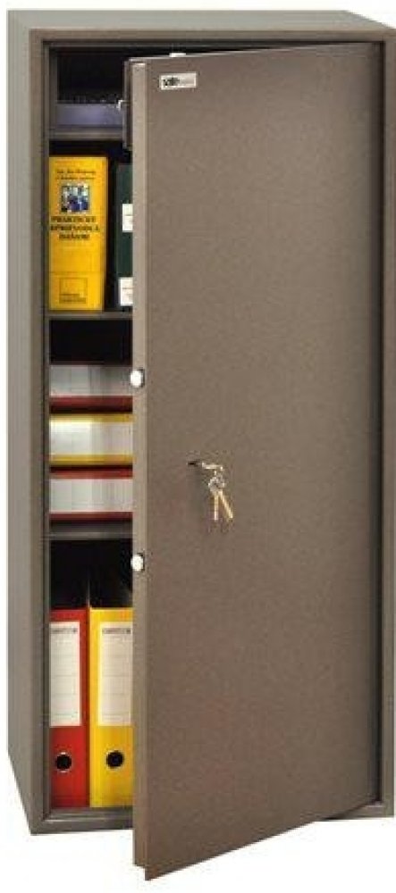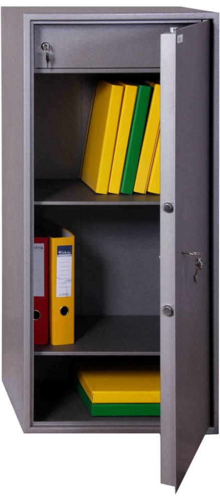 Zámek osazen trezorový, mechanický, ovládaný klíčem (součástí výrobku jsou 2 ks klíčů). Uvnitř sejfu je jedna vyjímatelná a výškově stavitelná police a uzamykatelná shcránka.
