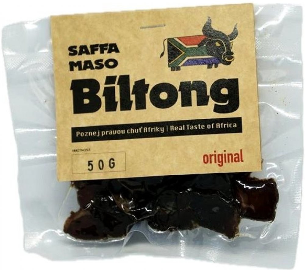 Sušené hovězí maso SAFFA MASO Biltong Original50 g Sušené hovězí maso SAFFA MASO Biltong Original je ideální pro sportovce, na túry, výlety i outdoorové výpravy. Stejně tak si ho vychutnáte rovněž doma jako rychlou večeři či svačinu. Vyrábí se ze šťavnatého hovězího masa, které je marinováno ve směsi a poté šetrně sušeno 7 až 10 dní. Nabízí bohatou a intenzivní masovou chuť. Na 100 g sušeného mas...