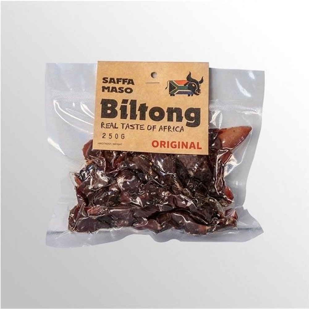 Sušené hovězí maso SAFFA MASO BiltongOriginal, 250 gSušené hovězí maso SAFFA MASO Biltong Original je ideální pro sportovce, na túry, výlety i outdoorové výpravy. Stejně tak si ho vychutnáte rovněž doma jako rychlou večeři či svačinu. Vyrábí se ze šťavnatého hovězího masa, které je marinováno ve směsi a poté šetrně sušeno 7 až 10 dní. Nabízí bohatou a intenzivní masovou chuť. Sušené maso pro fajnš...