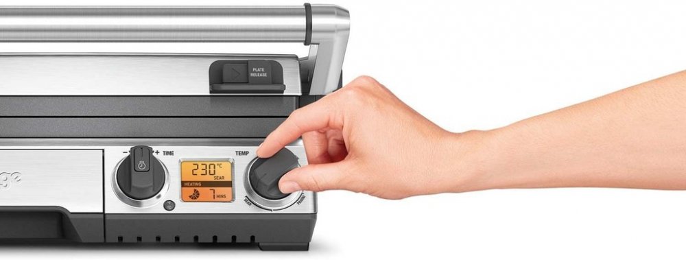 Displej BBQ grilu Sage The Smart Grill (BGR840BSS) přehledně zobrazuje nastavenou teplotu v rozsahu 160–230 °C, přičemž po zapojení teplotní sondy se zobrazuje druh masa a typ přípravy. Jednoduše tak nastavíte a přizpůsobíte režimy grilování vašeho oblíbeného pokrmu, teplotu a celkový čas přípravy.