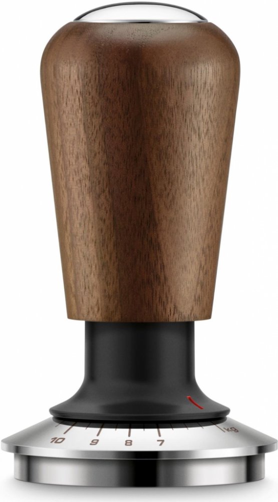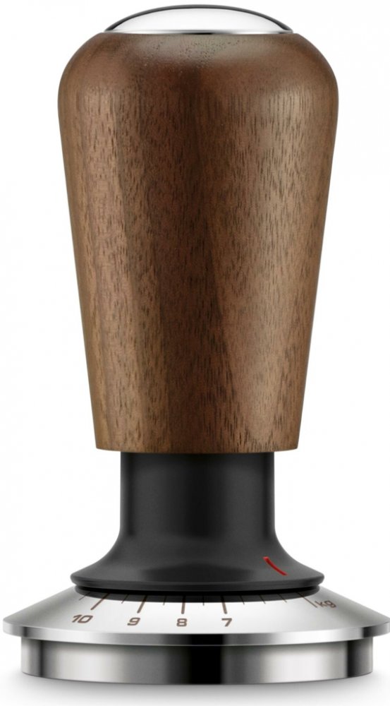 Tamper s pružinou, díky kterému regulujete sílu stlačení kávy do portafiltru s minimální námahou. Vyroben z nerezové oceli a ořechu, aby působil jako elegantní doplněk pro výrobky Sage.