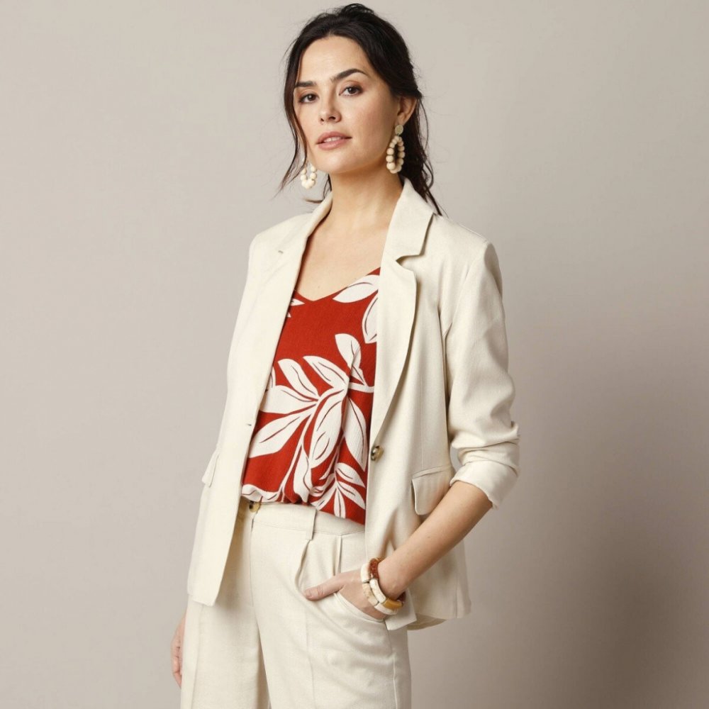 Chic nebo casual, záleží jen na Vás a na tom, s čím tento blejzr zkombinujete. Polodlouhý střih. Kostýmkový výstřih. Zapínání na 1 knoflík. Vpředu a vzadu přestřižení. V pase záševky. Ramenní vycpávky. Podsádka až k ramenním švům a na zadním dílu. Dlouhé rukávy s falešnou knoflíkovou légou. Kapsy s klopou a paspulkou. Vzadu skrytý rozparek. Rovný spodní lem. Lze prát v pračce.
