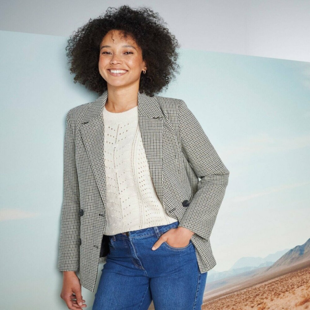 Sako s dvojitým knoflíkovým zapínáním vyniká pepito potiskem. Kostýmkový límec. Polodlouhý střih. Celé podšité. V pase záševky. Překřížené knoflíkové zapínání + 1 protiknoflík. 2 kapsy s paspulkou. Dlouhé rukávy. Vzadu uprostřed šev. Vnitřní podsádka sahající až k ramenním švům a zadní podsádka. Ramenní vycpávky. Konce rukávů a dolní lem s diskrétním zakončením. Lze prát v pračce.