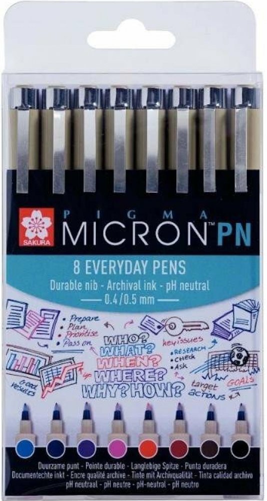 Kompletní sada se všemi barvami nové Pigma PN. Používejte je doma nebo v kanceláři pro náročné psaní, ale lze je použít i pro ruční psaní, psaní bullet journalu, návrhy, kresby, karikatury a mnoho dalšího. pera obsahují vysoce kvalitní pigmentový inkoust, který udržuje barvy stejně krásné jako v den, kdy jste inkoust nanesli. Obsah: Obsahuje 8 per v barvách červená 19, růžová, červená 21, vínová 22, fialová 24, modrá 36, černá 49, sépiová 117, modročerná 243.