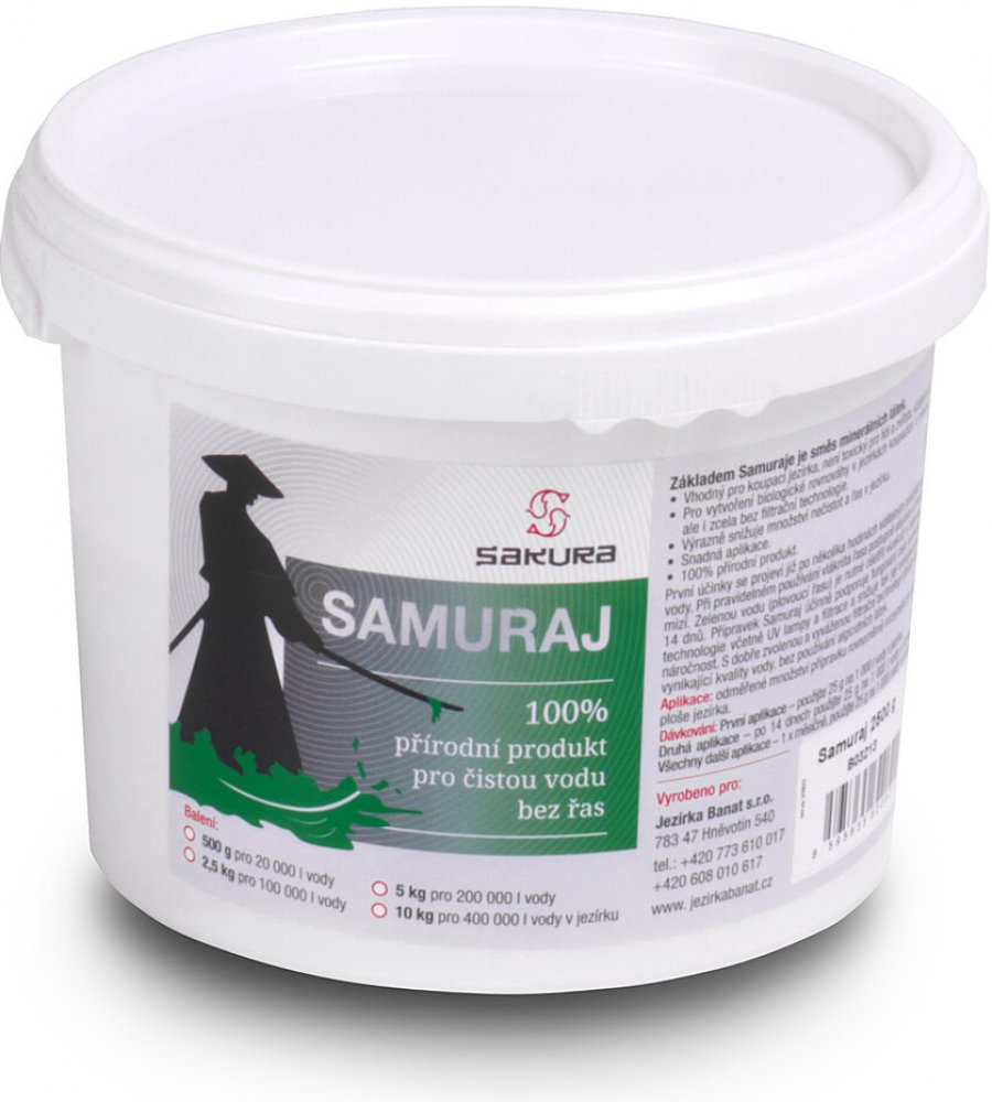 Samuraj 2500 g na 100 m3Základem Samuraje je směs minerálních látek.Vhodný pro koupací jezírka, není toxický pro lidi a zvířata, včetně ryb.Pro vytvoření biologické rovnováhy v jezírkách koupacích, s rybami, ale i zcela bez filtrační technologieVýrazně snižuje množství nečistot a řas v jezírkuSnadná aplikace100% přírodní produktPrvní účinky se projeví již po několika hodinách viditelným pročištěním vody. Při pravidelném používání vláknitá řasa postupně odumírá a trvale mizí. Zelenou vodu (plovoucí řasu) je nutné ošetřit vícekrát v intervalu 14 dnů. Přípravek Samuraj účinně podporuje fungování celé jezírkové technologie včetně UV lampy a filtrace a snižuje tak její energetickou náročnost. S dobře zvolenou a vyváženou filtrační technologií dosáhnete vynikající kvality vody, bez používání algicidních látek. Aplikace – odměřené množství přípravku rovnoměrně rozsypejte po celé ploše jezírka. Při aplikaci se všechny zařízení včetně UV-C lampy nechávají zapnutá. Přípravek používejte od teploty vody cca 10 supňů Celsia a vyšší.Dávkování:první aplikace – použijte 25 g na 1 000 l vody v jezírkudruhá aplikace – po 14 dnech použijte 25 g na 1 000 l vody v jezírkuvšechny další aplikace – 1 x měsíčně, použijte 25 g na 1 000 l vody v jezírkuSamuraj je určený pro zahradní jezírka s okrasnými rybami a koupací jezírka. Není testovaný pro chovy ryb pro konzumaci, zejména pro chovy pstruhů.K výrobě jsou používané výhradně přírodní ingredience, například vzácné jílové minerály, které mohou mít v závislosti na těžebním místě mírně odlišné zbarvení, které se následně přenese i do hotového produktu. Odlišné zbarvení nemá vliv na kvalitu a účinnost výrobku.