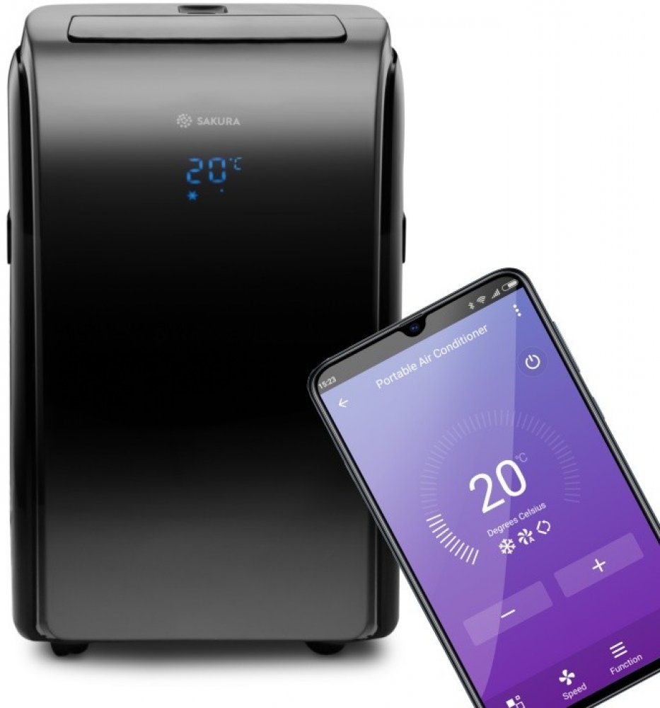 Mobilní klimatizace Sakura STAC 12 CPB/K s vysokým chladicím výkonem a možností ovládání pomocí aplikace v mobilním telefonu připojeném na Wi-Fi. Vhodná do místnosti o velikosti až 38 m2. Možnost nastavení nočního režimu. Moderní čistý design, komfortní ovládání a ekologické chladivo. Automatické odpařování kondenzátu. Funkce odvlhčování. Ovládání klimatizace pomocí Wi-Fi Pohodlné a rychlé ovládán...