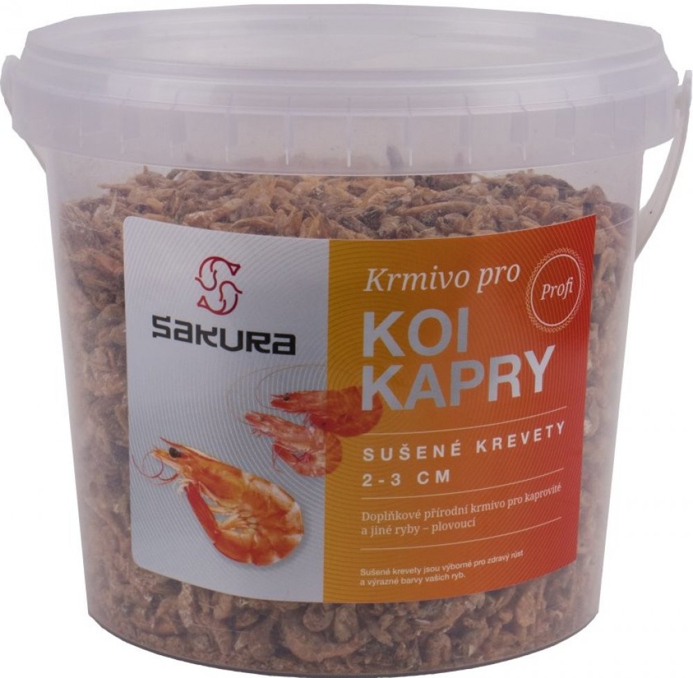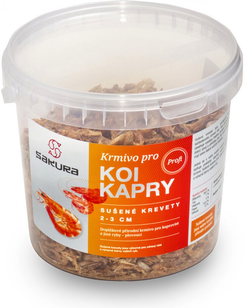 Sušené krevety Sakura 2-3 cm 2 l 250 g Doplňkové přírodní krmivo pro kaprovité a jiné ryby – plovoucí Sušené krevety jsou vynikajícím obohacením každodenního krmení Koi. Tato pochoutka pro ryby obsahuje vysokou hladinu proteinu a pomáhá zajistit dobrý vývoj a přírůstky ryb. Na slunci sušené krevety mají velmi dobré nutriční hodnoty. Jedná se o velmi kvalitní přírodní produkt, který splňuje praktic...