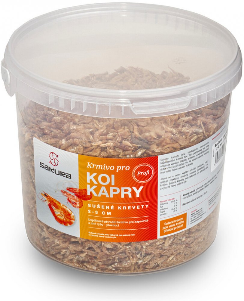 Sušené krevety Sakura 2-3 cm 5 l 650 g Doplňkové přírodní krmivo pro kaprovité a jiné ryby – plovoucí Sušené krevety jsou vynikajícím obohacením každodenního krmení Koi. Tato pochoutka pro ryby obsahuje vysokou hladinu proteinu a pomáhá zajistit dobrý vývoj a přírůstky ryb. Na slunci sušené krevety mají velmi dobré nutriční hodnoty. Jedná se o velmi kvalitní přírodní produkt, který splňuje praktic...