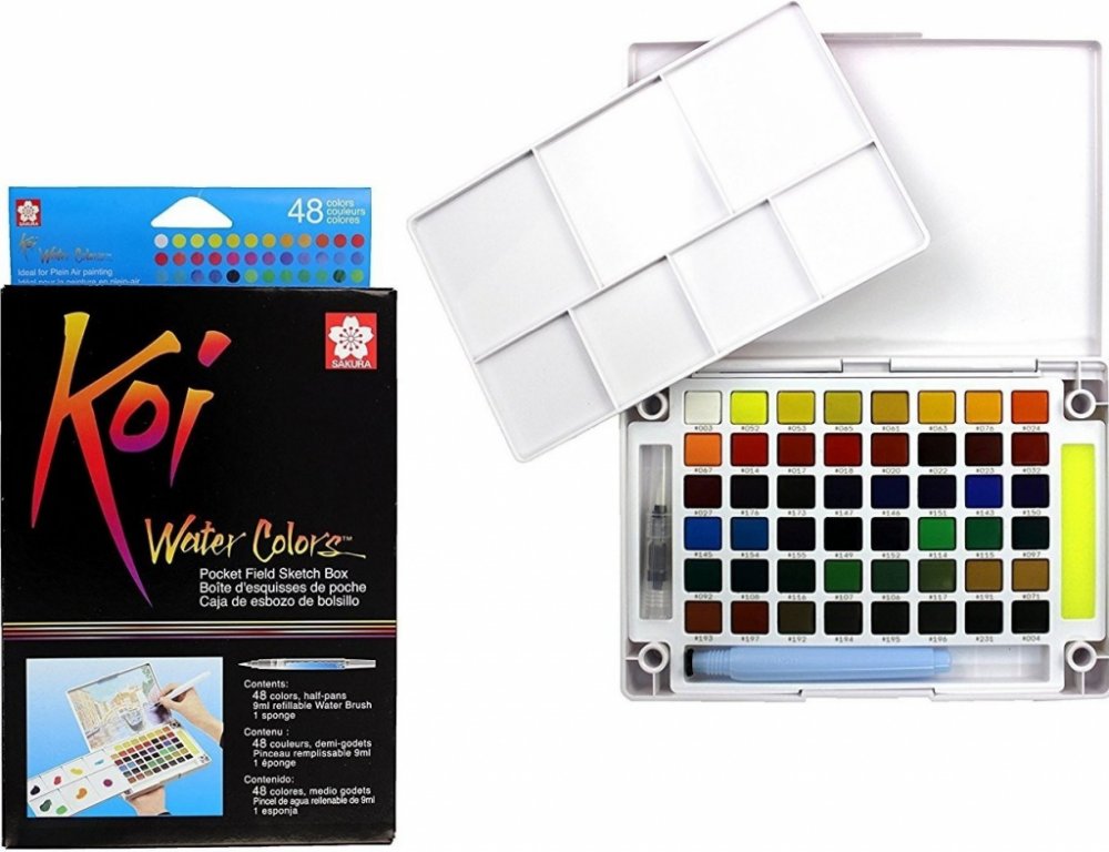 Používejte transparentní akvarelové barvy Koi® na situační kresbu přírody, města nebo jen dvorku. Lehké a praktické balení dělá tyto přenosné výstroje snadno vlouditelné do kapsy košile či bundy. Koi je jednoduché svým použitím a zároveň zjistíte své umění ve špičkách prstů. I malířské použití je jednoduché. A teď už jen najít vhodný výhled, hřebeny hor a další poutavou krajinu.