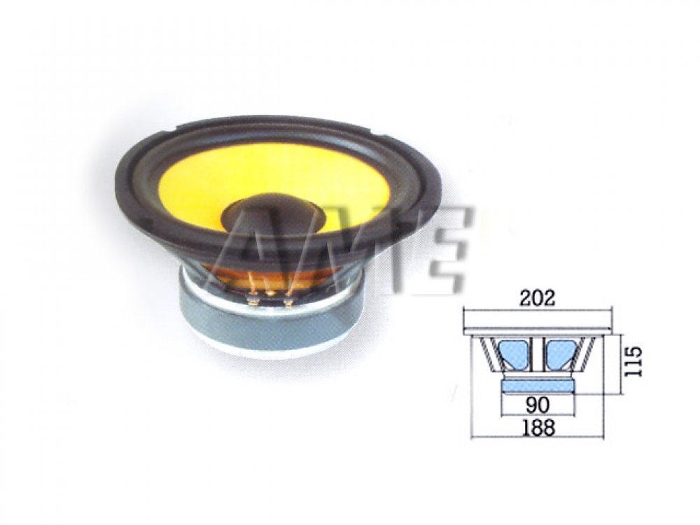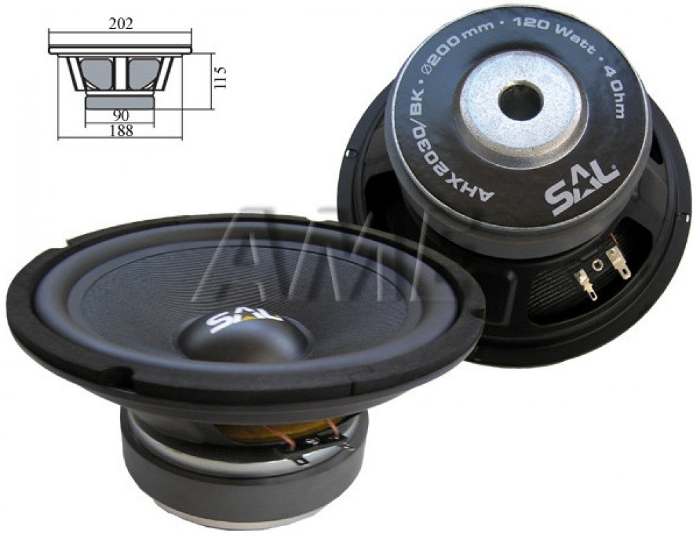 Reproduktor SAL AHX2030/BK 4ohm/120W - basový reproduktor Basový, 202mm, kevlar 40-4000Hz, 88dB, kevlar membrána s gumovým závěsem, cívka na hliníkovém těle, určeno pro náročnější použití. Optimální objem basreflexové ozvučnice je 18l, nátrubek KAH404/280mm.