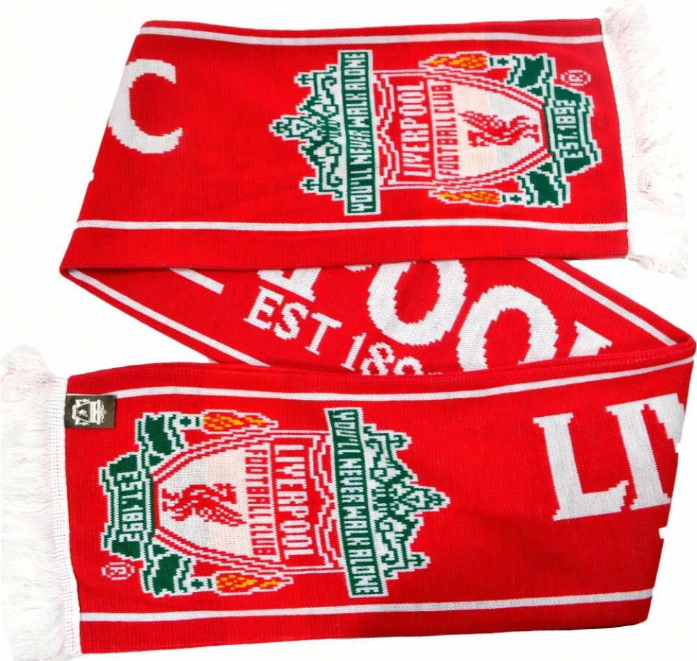 Šála Liverpool FC v kombinaci červené a bílé barvy. Uprostřed nápis Liverpool FC v kontrastní barvě. Na obou koncích je znak klubu. Zakončena třásněmi. Příjemný materiál.