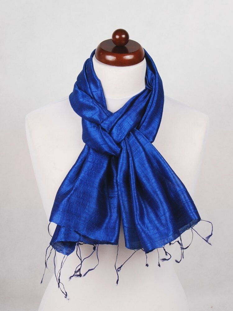 Modrá šála a s drobnými tmavě modrými třásněmi. Ručně vyrobená ze surového hedvábí, pro které je charakteristická jemná nerovnost vlákna s různě velkými hrbolky. Vzhledem k zvláštní struktuře lze šálu nosit jak vyžehlenou, tak i zmačkanou, omotanou okolo krku. S exkluzivním vzhledem a leskem hedvábí a s velmi zajímavou strukturou.