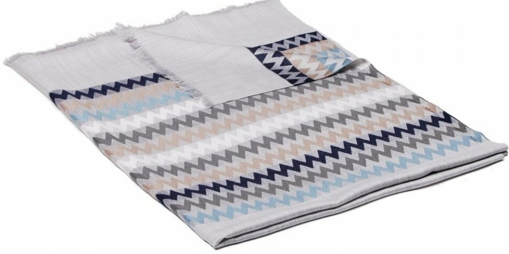 Elegantní a kvalitní indická šála vyrobená ze směsi viskózy s hedvábím (70% viskózy a 30% hedvábí) ve světle šedé žíhané barvě s příčnými proužky na koncích v bílé, světle šedomodré, černomodré, šedohnědé a šedé barvě. S elegantním rovným zakončením. Příjemná na omak, s lesklostí a hebkostí hedvábí.