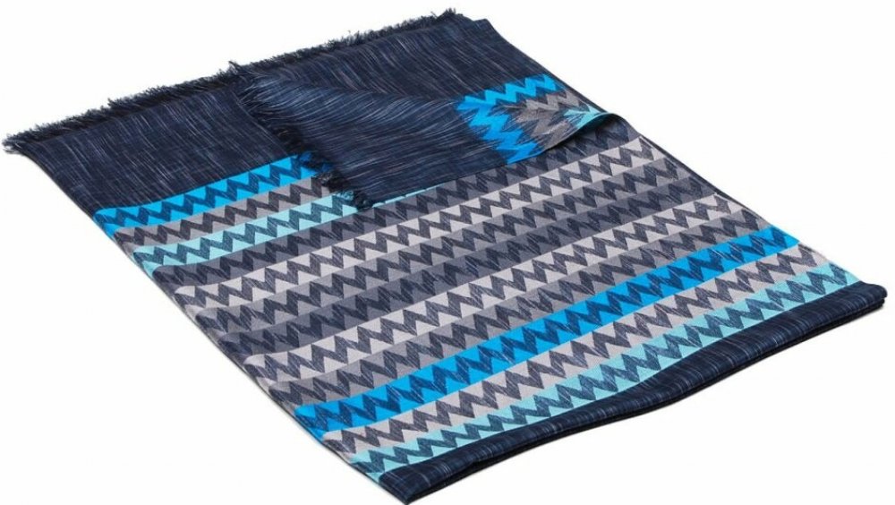 Elegantní a kvalitní indická šála vyrobená ze směsi viskózy s hedvábím (70% viskózy a 30% hedvábí) v tmavě šedé žíhané barvě s příčnými proužky na koncích v bílé, světle tyrkysové, tyrkysové, světe šedé, šedé a tmavě šedé barvě. S elegantním rovným zakončením. Příjemná na omak, s lesklostí a hebkostí hedvábí.