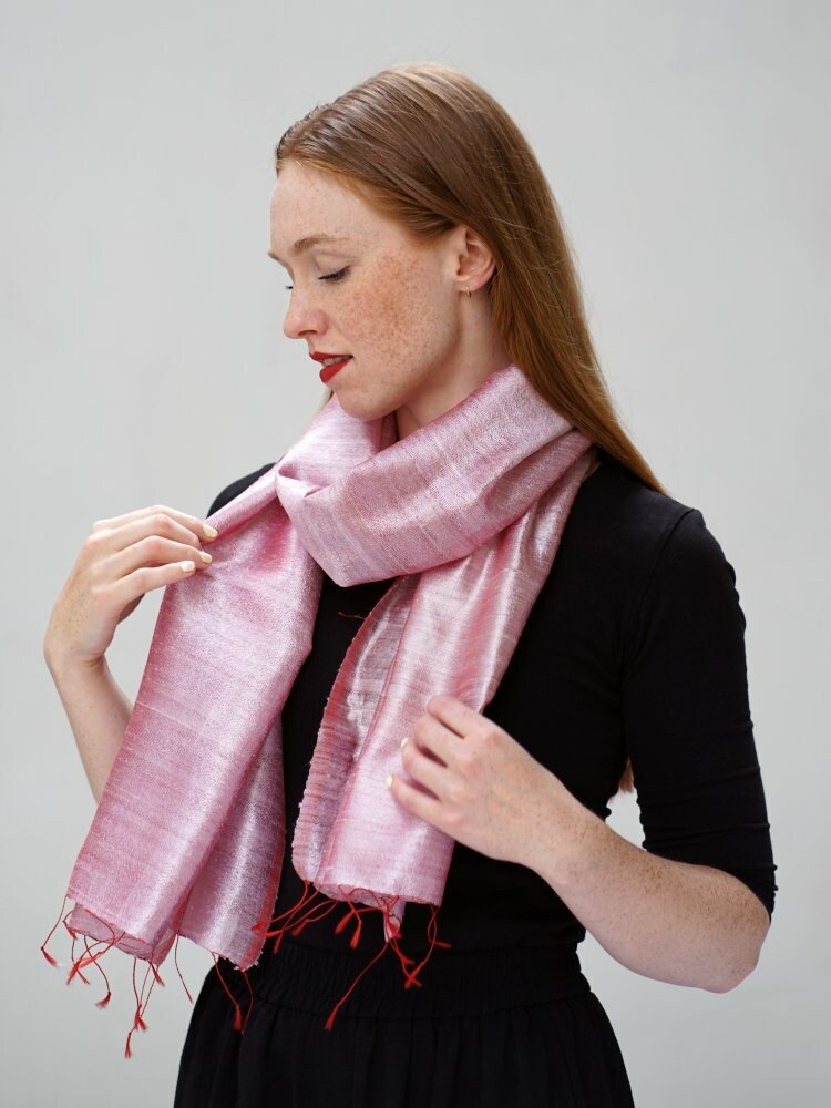 Světle růžová šála s drobnými červenými třásněmi. Ručně vyrobená ze surového hedvábí, pro které je charakteristická jemná nerovnost vlákna s různě velkými hrbolky. Vzhledem k zvláštní struktuře lze šálu nosit jak vyžehlenou, tak i zmačkanou, omotanou okolo krku. S exkluzivním vzhledem a leskem hedvábí a s velmi zajímavou strukturou.