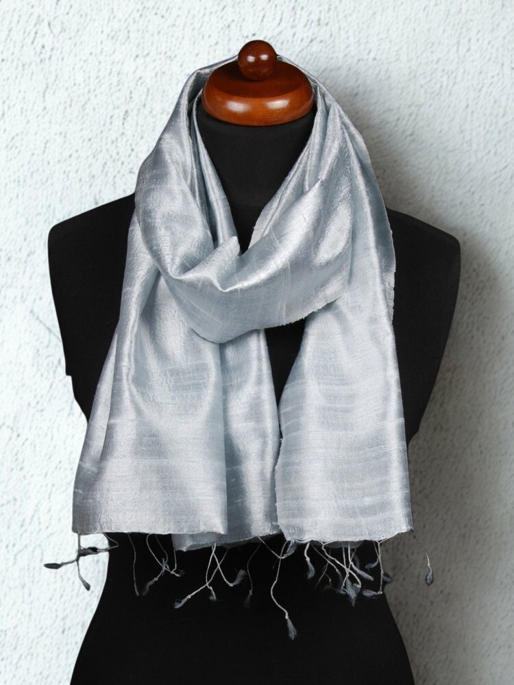 Světle šedá šála a s drobnými šedými třásněmi. Ručně vyrobená ze surového hedvábí, pro které je charakteristická jemná nerovnost vlákna s různě velkými hrbolky. Vzhledem k zvláštní struktuře lze šálu nosit jak vyžehlenou, tak i zmačkanou, omotanou okolo krku. S exkluzivním vzhledem a leskem hedvábí a s velmi zajímavou strukturou.