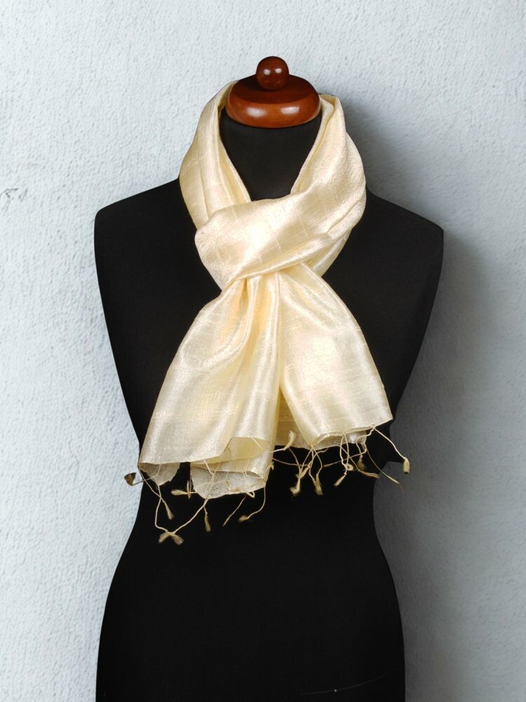 Světle žlutá šála s drobnými světle žlutými třásněmi. Ručně vyrobená ze surového hedvábí, pro které je charakteristická jemná nerovnost vlákna s různě velkými hrbolky. Vzhledem k zvláštní struktuře lze šálu nosit jak vyžehlenou, tak i zmačkanou, omotanou okolo krku. Ze začátku je trochu tvrdší, ale ihned po prvním vyprání i nošením krásně změkne, takže se příjemně nosí. S exkluzivním vzhledem a leskem hedvábí a s velmi zajímavou strukturou.
