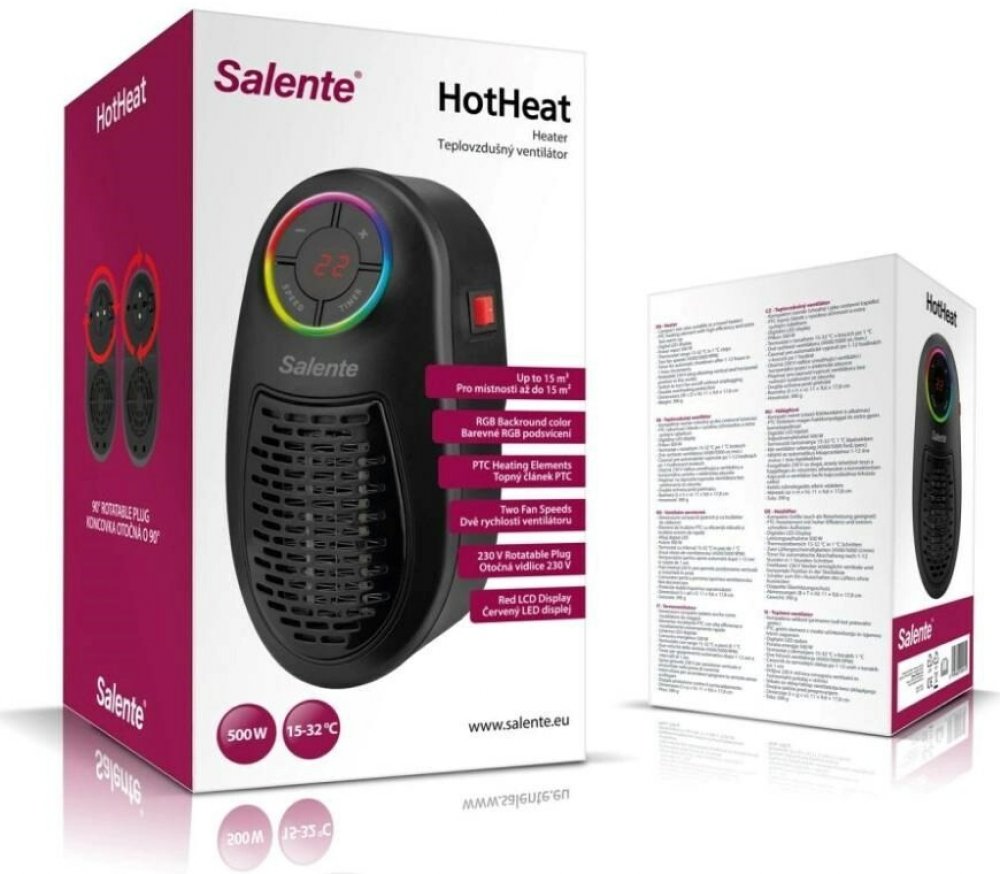 Díky PTC topnému článku a příkonu 500 W vás Salente HotHeat přivítá hřejivým objetím hned po zapnutí. Chcete si ráno hodit sprchu, ale v koupelně je po chladné noci (mírně řečeno) nevlídno? Zastrčte Salente HotHeat do zásuvky a za chvilku bude líp. Nebo se vracíte z horské túry do vychladlé chaty a jste celí promrzlí? Zásluhou tohoto teplovzdušného ventilátoru roztajete podobně rychle jako kousek rampouchu v dlani. Přístroj totiž začíná hřát bez zbytečného vyčkávání a navíc je vybaven výkonným ventilátorem, který dokáže teplo rychle rozšířit do celé místnosti.