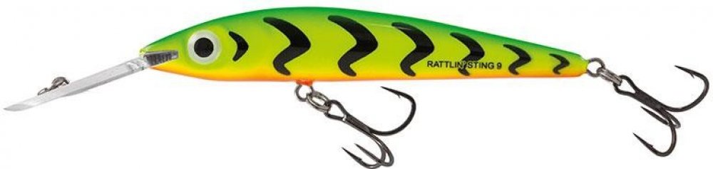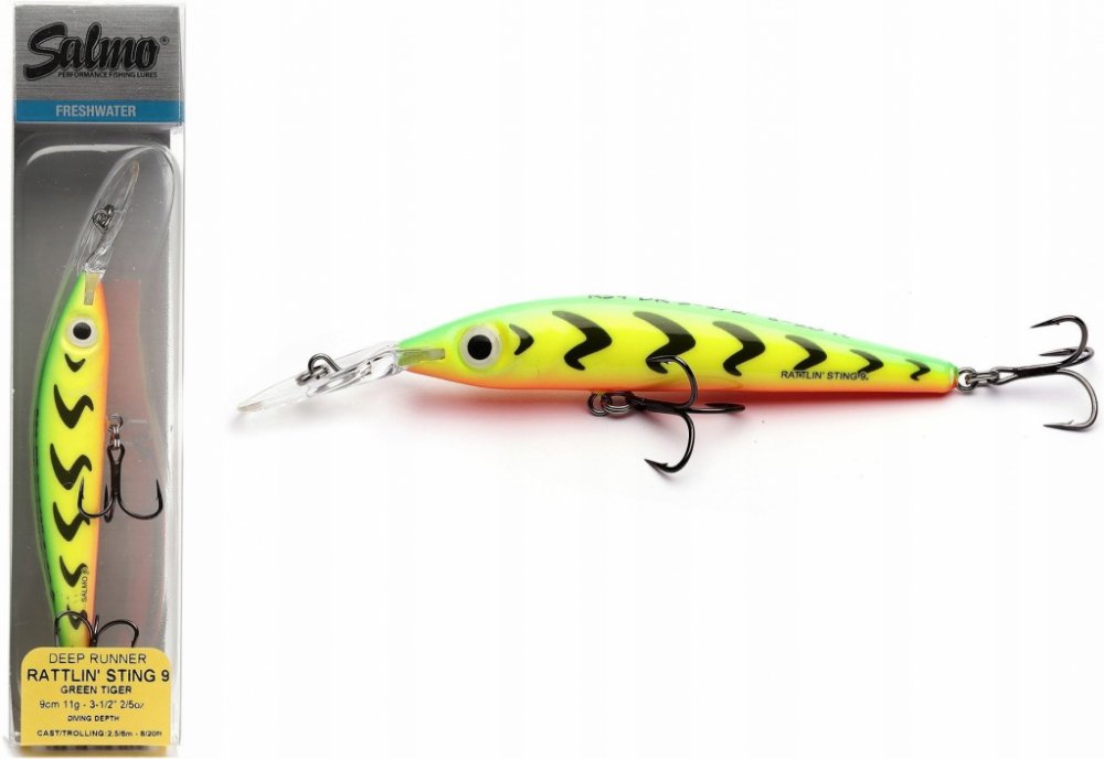 Wobler Salmo je výborná vláčecí nástraha kopírující pohyb ryb. Je dlouhý 90 mm a výborně se tak hodí pro lovení větších dravců. Ponorné provedení wobleru značí, že wobler po nahození zdlouhavě klesá ke dnu. Návnada má výborné vybalancování hmotnosti, a proto je pro ryby přitažlivá a pořádný úlovek na sebe nenechá dlouho čekat. Vmontované chrastítko ještě více zvedá atraktivitu nástrahy, proto zaujme všechny dravé ryby v okolí. Nejdůležitější parametry wobleru Salmo Rattlin´ Sting Deep Runner 9cm 12g Green Tiger Provedení wobleru: potápivé Vynikajíci vláčecí návnada kopírující drobné ryby Wobler disponuje chrastítkem, které ještě více zvedá atraktivitu nástrahy Délka wobleru: 90 mm Váha: 12 g