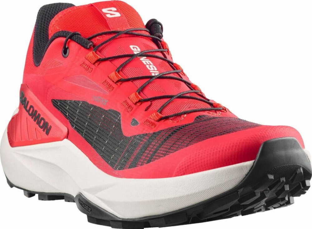 Pánské trailové běžecké boty Salomon Genesis Man jsou navrženy pro běžce, kteří se pohybují v technickém a proměnlivém terénu a vyžadují maximální jistotu, ochranu a kontrolu pohybu. Model Genesis kombinuje dynamiku, pohodlí a přesnost bez ohledu na povrch. Svršek z vysoce odolného materiálu Matryx®, zesíleného kevlarovými vlákny (Kevlar®), nabízí výjimečnou odolnost proti oděru při zachování nízké hmotnosti a dobré prodyšnosti. Technologie EndoFit™ zajišťuje přesné vnitřní obepnutí chodidla a stabilní usazení i při rychlých změnách směru. Mezipodešev z pěny optiFOAM poskytuje střední úroveň tlumení, která vyvažuje komfort a citlivý kontakt s terénem. O lepší vedení nohy, obratnost a plynulost pohybu se stará konstrukce activeChassis™. Podešev All Terrain Contagrip® s výstupky o výšce 4,5 mm zajišťuje spolehlivou trakci na kamenitém i smíšeném povrchu, za sucha i za mokra. Rychlé a přesné utažení umožňuje systém quickLACE™, který usnadňuje obouvání i zouvání.
