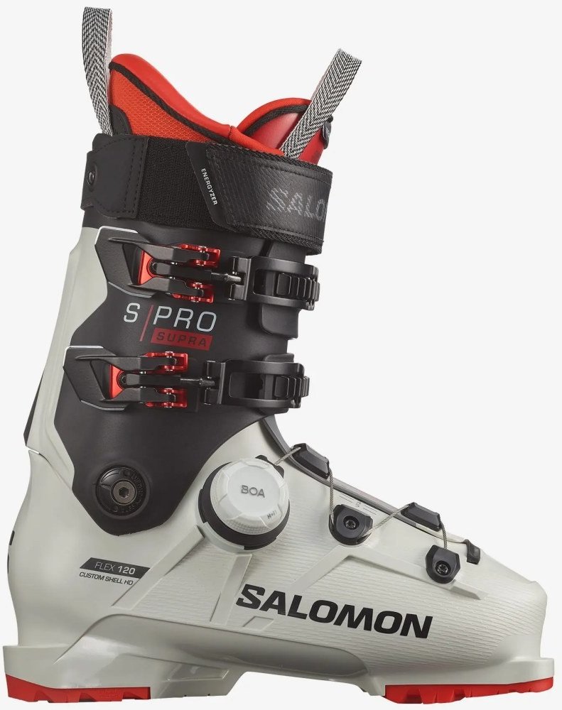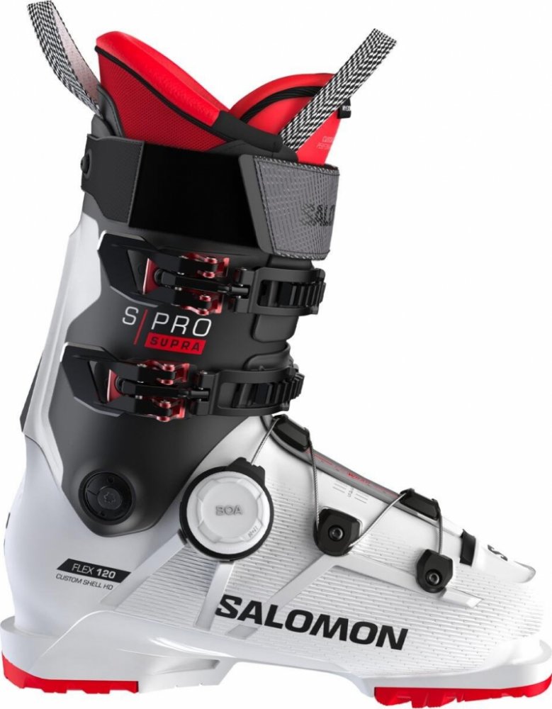 Špičkové sjezdové boty s flexí 120, systémem BOA® a technologií ExoWrap® pro maximální fixaci a výkon. | Salomon S/PRO Supra BOA Red 120 GW představují novou generaci sportovních lyžařských bot určených pro pokročilé lyžaře, kteří vyžadují precizní fixaci nohy a maximální kontrolu nad lyžemi. Díky inovativnímu BOA® Fit System s mikronastavením a konstrukci ExoWrap® zajišťují boty rovnoměrné obepnutí chodidla, což přináší vyšší pohodlí i okamžitou reakci při přenášení sil z hrany na hranu.Skelet z polyuretanu s technologií Custom Shell HD umožňuje rychlé tepelně tvarovatelné přizpůsobení během 10 minut, zatímco Power Spine kovová výztuha propojující skořepinu a manžetu poskytuje silnou oporu lýtek a progresivní odraz při zatáčení.Vnitřní ExoWrap® 4D Perf botička s elastickým pásem pevně fixuje chodidlo, zatímco ergonomická stélka Light² zvyšuje komfort během celodenního lyžování. Boty jsou osazeny podrážkami GripWalk pro bezpečnou chůzi mimo sjezdovku a disponují nastavitelným 6mm spoilerem, který umožňuje větší dopředný náklon.S flexí 120, šířkou Medium a hmotností 1870 g na kus (3740 g/pár) se jedná o boty, které kombinují přesnost, stabilitu a vysoký výkon i v těch nejnáročnějších podmínkách. Díky plně servisovatelným komponentům a dlouhé životnosti jsou ideální volbou pro sportovní lyžaře, kteří hledají maximální jistotu a pohodlí v jednom.