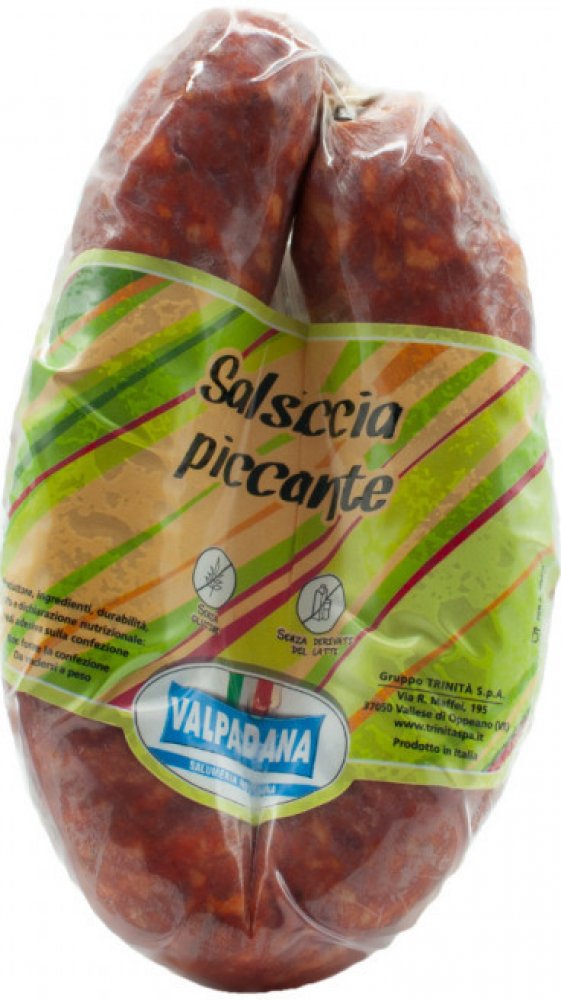 Spotřebitelské balení:1 kgČeský název:Vepřový pikantní salámItalský název:Salsiccia piccante dritta Složení: Vepřová maso (UE), sůl, koření, extrakt z papriky, pikantní papričky, dextróza, aroma, přírodní aroma, uzené aroma, antioxidanty: E316, konzervanty: E250, E252. Nutriční hodnoty: Energetická hodnota na 100 g 1445 kj / 347 kcal Tuky (g): 26,9 z toho Nasycené mastné kyseliny (g): 12,7 Sacharidy (g): 2,38 z toho Cukry (g): 0,23 Polyalkoholy (g): 0 Škroby (g): 0 Vláknina (g): 0, Bílkoviny (g): 24,7 Vitamíny (g): 0 Minerální látky (g): 0 Sůl (g): 4,4. Alergeny: Neobsahuje.