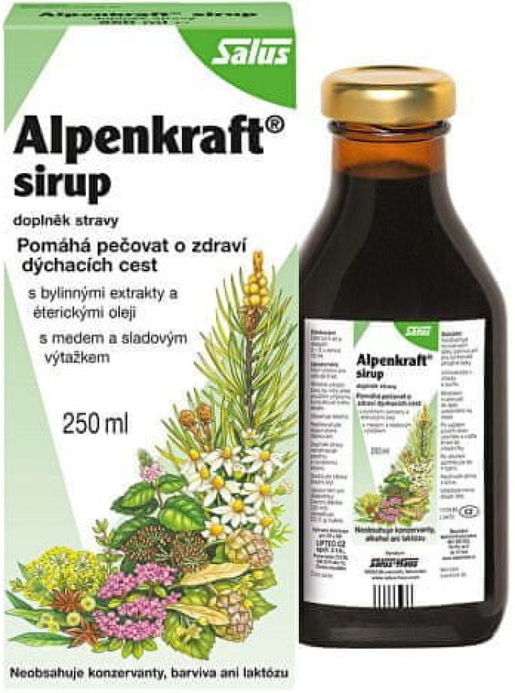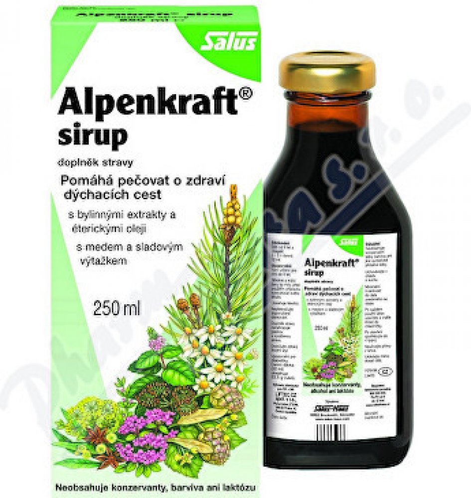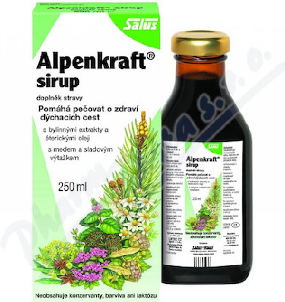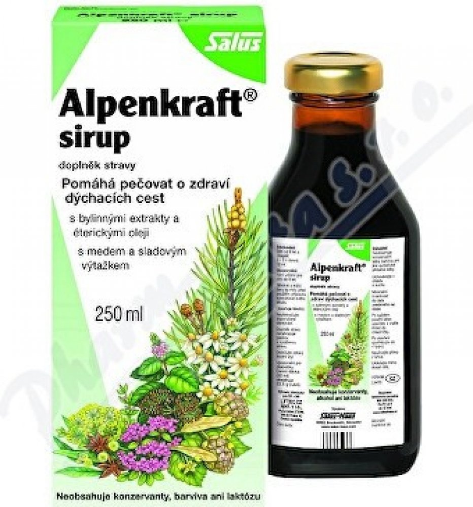 Obsah: 250 mlDávkování: dospělí 3 – 5x denně 10 ml děti 6 – 12 let 3 – 5x denně 5 ml Sirup nechte rozplynout v ústech, nezapíjejte! Složky obsažené v Alpenkraftu působí na sliznici v dutině ústní a v krku.