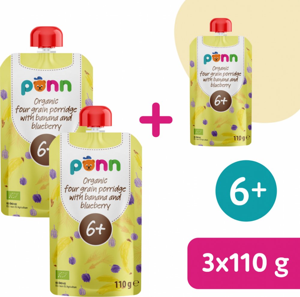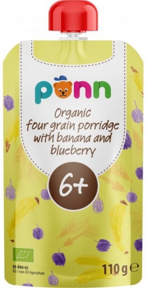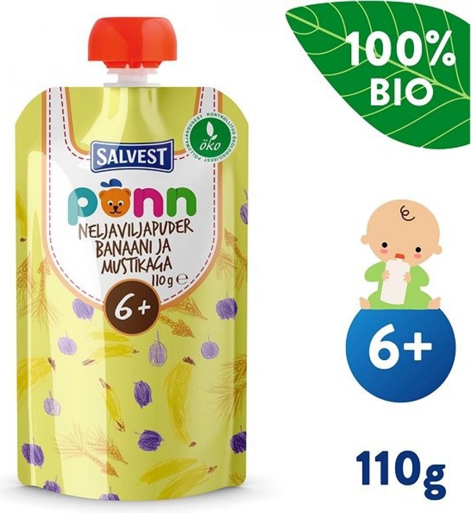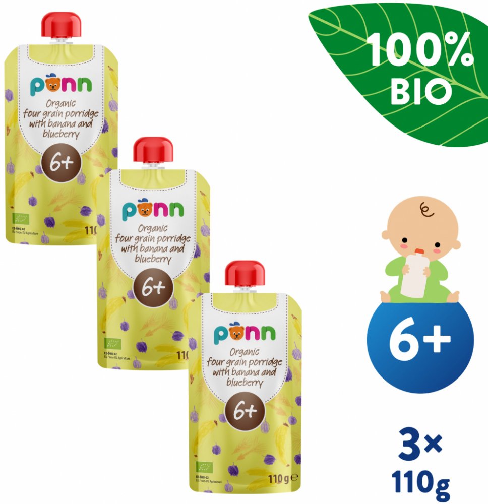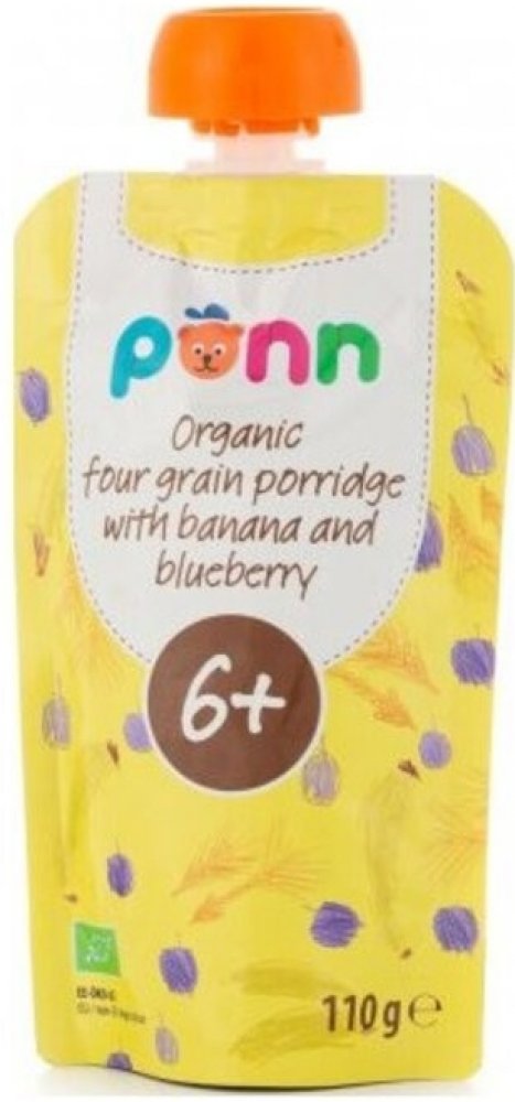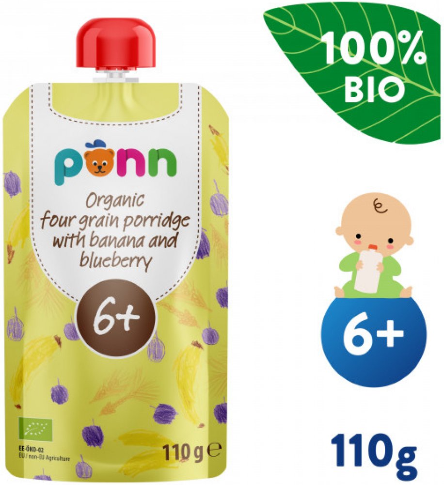 Kapsička s praktickým uzávěrem obsahuje bio banánové a borůvkové pyré, které doplňují žitné, ovesné, pšeničné a ječmenné vločky. Není do ní přidáván žádný další cukr, umělá barviva, aromata ani konzervanty. Výrobek je tepelně opracovaný a jeho trvanlivost zajišťuje šetrná sterilizace. Ovocný příkrm byl vyvinut ve spolupráci s pediatry. Díky této kapsičce si vaše šestiměsíční miminko může smlsnout nejen na ovoci, ale také na chuťově vyvážené směsi vybraných obilovin.
