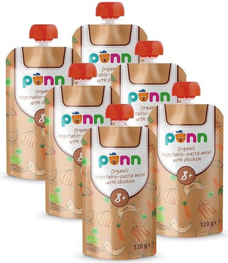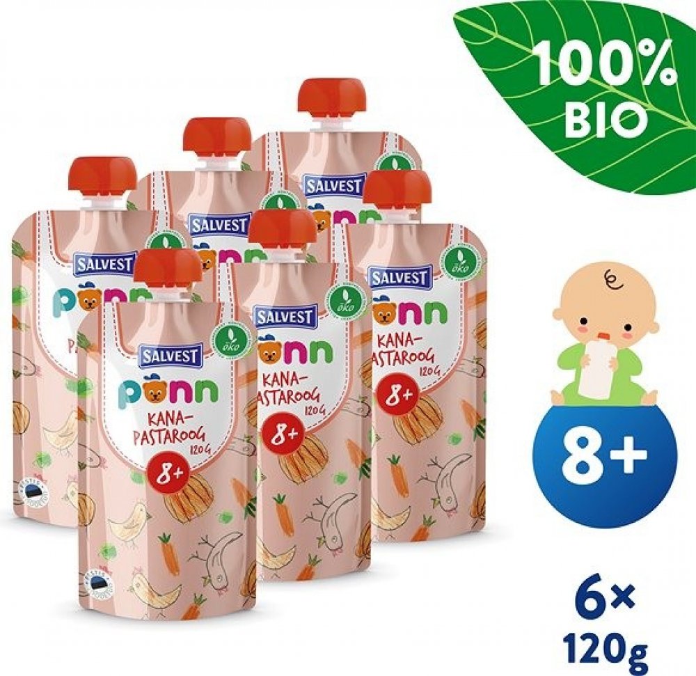 SALVEST Ponn BIO Kuřátko s těstovinami 6× 120 g Zeleninovo-masový příkrm obsahuje šťavnatá kuřecí prsíčka, dýni, jablečné pyré, mrkev a těstoviny, vše v BIO kvalitě. Kapsička s praktickým uzávěrem je ideální, pokud vaše dítě nesní celou porci najednou. Výrobek je tepelně opracovaný a sterilizovaný pro dlouhou trvanlivost. Vytvořeno ve spolupráci s pediatry. Od ukončeného 8. měsíce Vhodné od 6× 120...