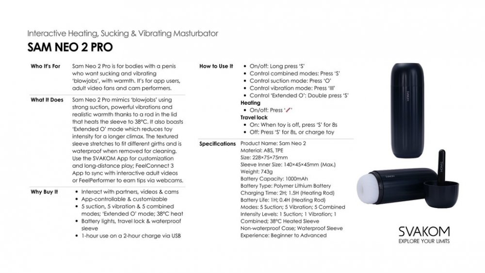 Tato vylepšená verze původního modelu Sam Neo poskytuje teplo tělesné teploty a výkonné sání a vibrace, zatímco tlustý strukturovaný návlek masíruje váš penis. Díky chytré funkci SVAKOM „Extended O“, která okamžitě sníží intenzitu hračky, bude váš orgasmus trvat ještě déle.