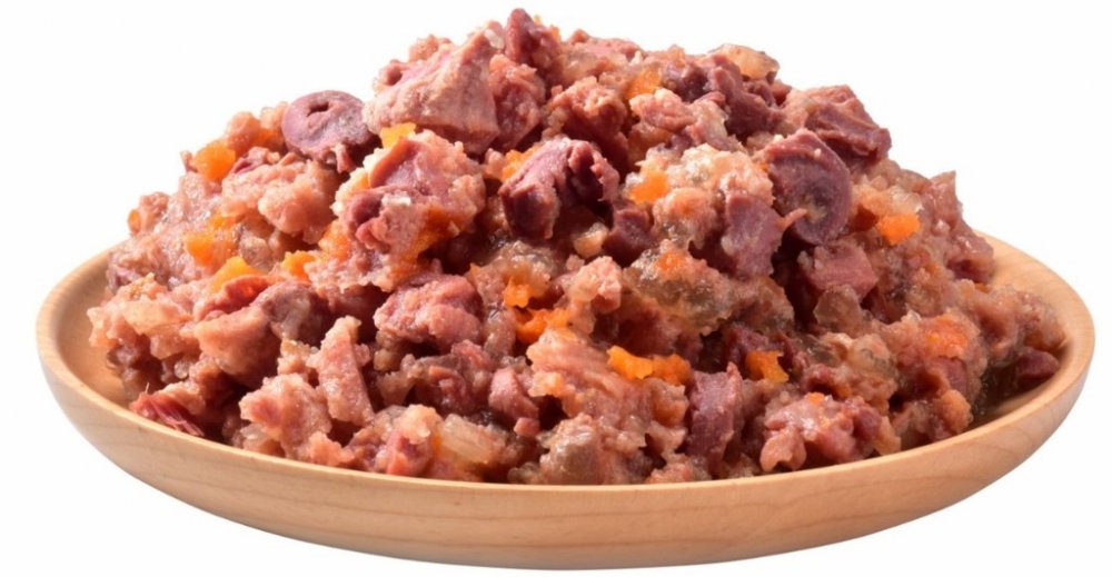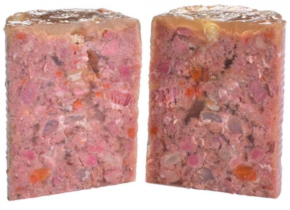 Složení: 51 % kuřecího, 15 % kuřecích jater, 4 % mrkev, 2 % hrachová mouka, 1 % lignocelulóza, 0,5 % lososový olej, 26,5 % vývar.