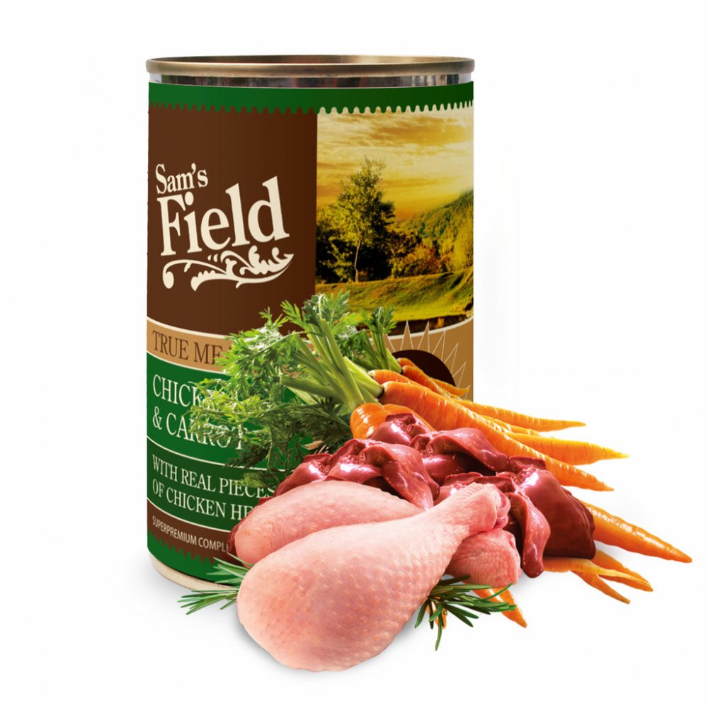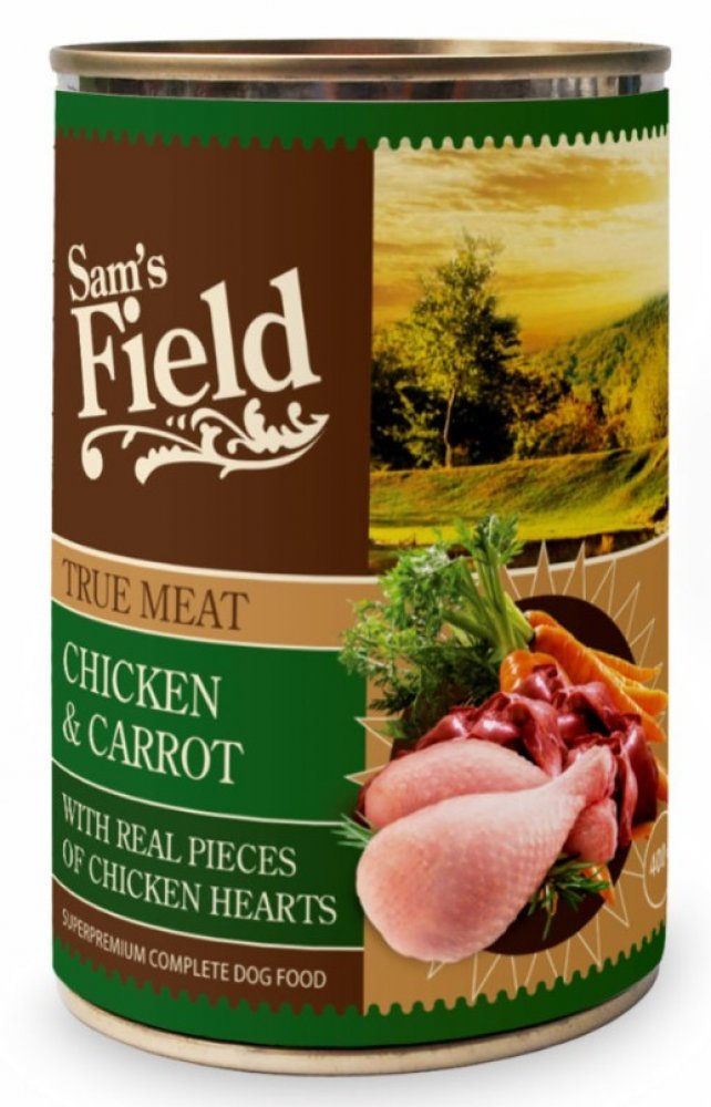 Sam's Field True Chicken Meat & Carrot. Superprémiová masová konzerva pro psy s vysokým obsahem 66 % pravého kuřecího masa a kuřecích jater, s mrkví. Se skutečnými kousky kuřecího srdce.