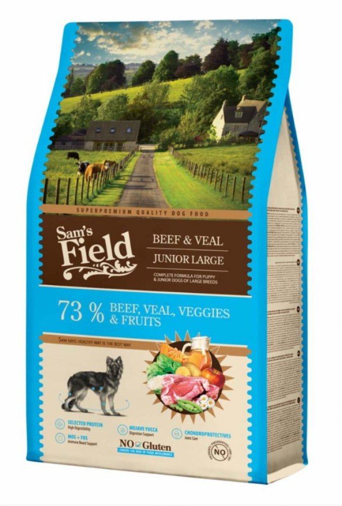 Sam's Field Gluten Free Beef & Veal Junior Large. Superprémiové bezlepkové krmivo pro mladé psy velkých a obřích plemen s vysokým obsahem sušeného hovězího 28 % a sušeného telecího 20 % masa.
