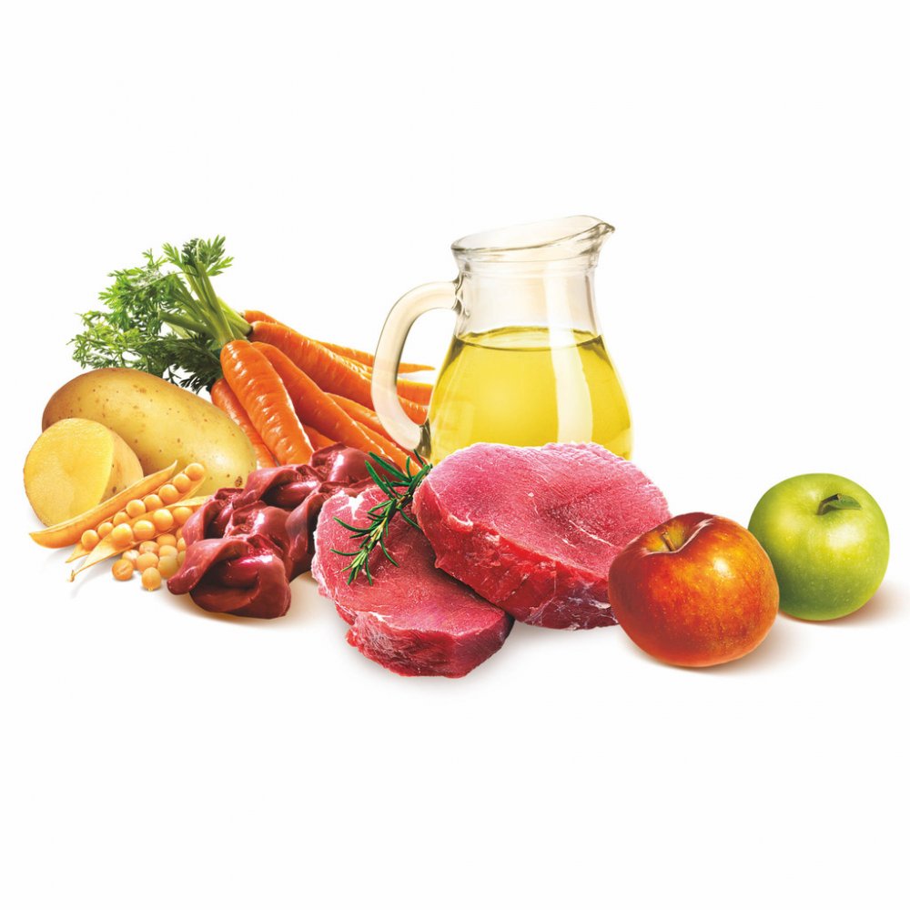 Složení: 28 % hovězího Angus (18 % moučky z hovězího Angus, 10 % čerstvého hovězího Angus), 22 % kuřete, 20 % brambor, 9 % drůbežího tuku (konzervovaný směsí tokoferolů, zdroj vitamínu E), 8 % žlutého hrachu, 5 % sušených jablek, 3 % lososového oleje, 2 % kuřecích jater, pivovarských kvasnic (zdroj mannanoligosacharidů), 1 % mrkve, glukosaminu (300 mg/kg), chondroitin sulfátu (180 mg/kg), výtažku z rostliny Yucca schidigera (100 mg/kg), heřmánku (Matricaria chamomilla, 80 mg/kg). Neobsahuje obiloviny kvůli vyloučení rizika potravinové intolerance. (Procentuální obsah surovin v krmivu je uveden v sušině dle EC 767/2009)