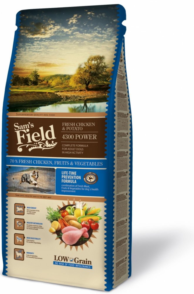 Sam's Field Low Grain 4300 Power Chicken & Potato. Superprémiové bezpšeničné krmivo s vysokým obsahem kuřete 39 % a kuřecích jater 12 %.