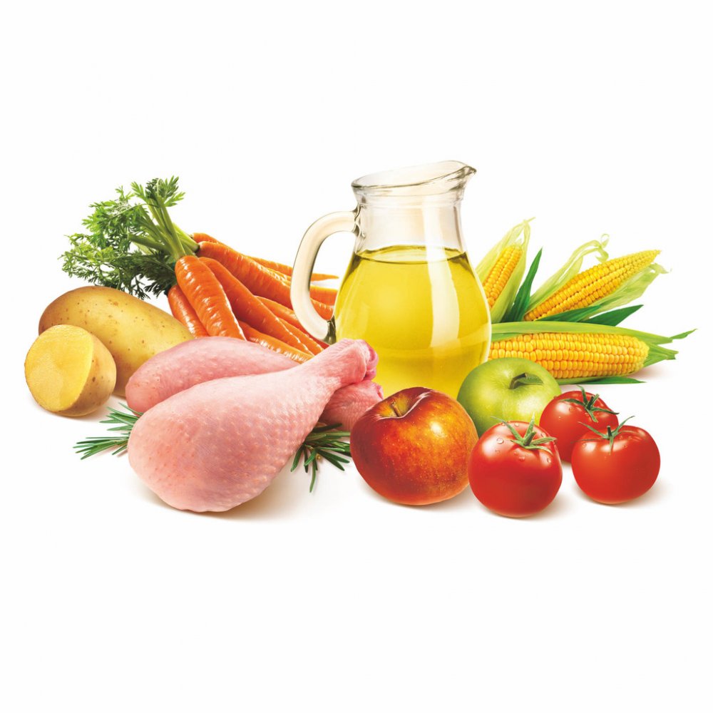Superprémiové krmivo s nízkým obsahem obilovin (bezpšeničná receptura) a vysokým obsahem 31 % kuřete a 12 % kuřecí játry, 9 % brambor, kukuřice, kuřecího tuku (chráněno směsí tokoferolů, zdroj vitamínu E), lososového oleje, přírodní příchutě, sušených jablek, pivovarských kvasnic, rajčat, extraktu z juky, mrkve, mi...