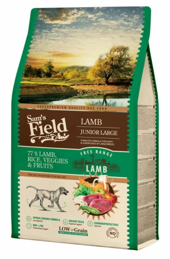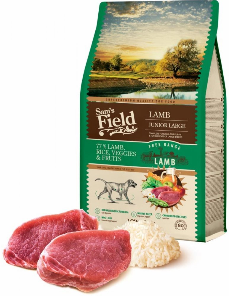 Granule 2,5 kg, Sam's Field Low Grain Junior Large Lamb - Free Range, superprémiové granule pro štěňata a mladé psy velkých plemen s jehněčím z volného chovu, (Sams Field bez pšenice): 77 % (sušené jehněčí, rýže, zelenina, ovoce), s vysokým obsahem sušeného jehněčího z volného chovu 28 % a rýže 28 %, kompletní superprémiové krmivo pro štěňata a mladé psy velkých plemen, krmivo bez pšenice (Low Gra...