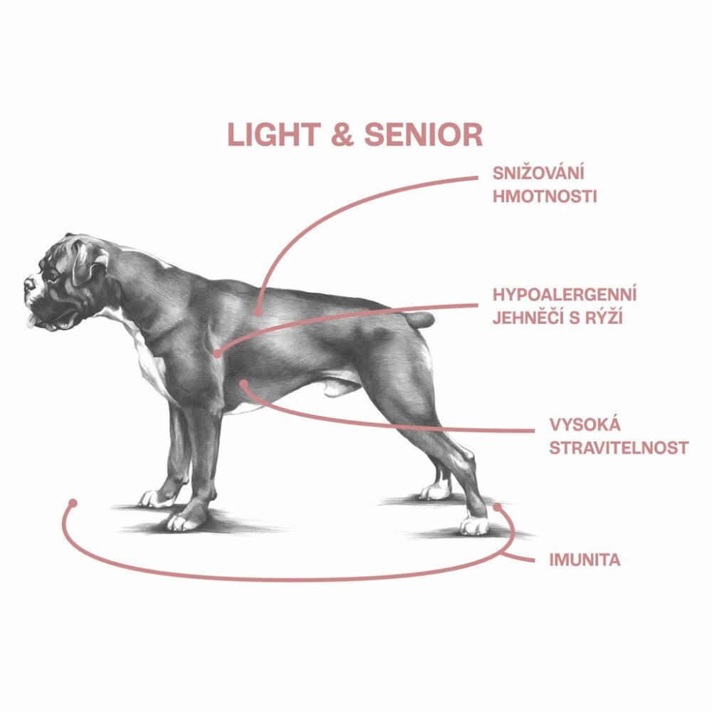 Kompletní krmivo pro psy všech plemen s nadváhou a starší psy, zvláště vhodné pro hypoalergenní výživu nebo pro psy se speciálními nároky na výživu.