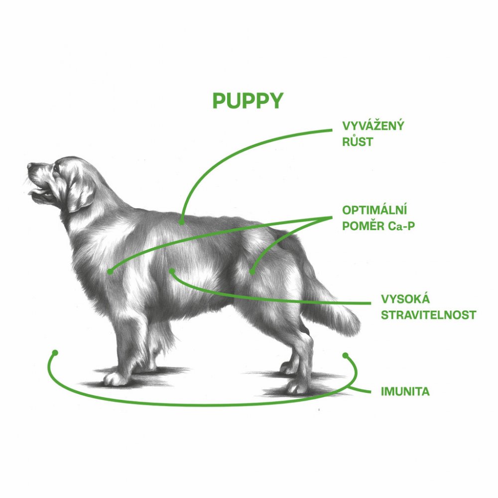 Superprémiové krmivo s nízkým obsahem obilovin (bezpšeničná receptura) a vysokým obsahem 33 % kuřete a 15 % kuřecí játry, 6 % brambor, kukuřice, kuřecího tuku (chráněno směsí tokoferolů, zdroj vitamínu E), lososového oleje, přírodní příchutě, sušených jablek, pivovarských kvasnic, rajčat, extraktu z juky, mrkve, minerálů, DL-metioninu, L-lysinu, mannanoligosacharidů, fruktooligosacharidů, probiotik, určené pro štěňata a mladé psy všech plemen ve věku od 1–12 měsíců. (Procentuální obsah surovin v krmivu je uveden v sušině dle EC 767/2009)